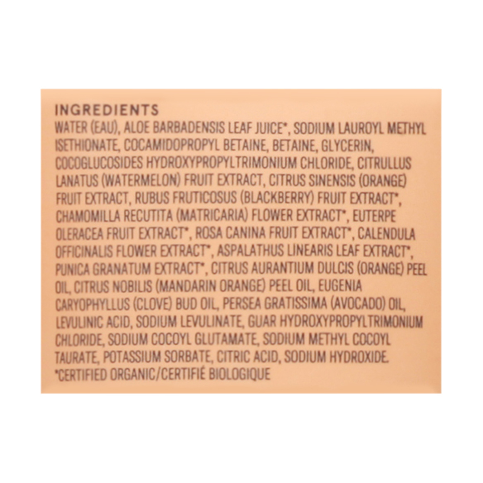 ingredients : water (eau);aloe barbadensis leaf juice;sodium lauroyl methyl isethionate;cocamidopropyl betaine;betaine;glycerin;cocoglucosides hydroxypropyltrimonium chloride;citrullus lanatus (watermelon) fruit extract;citrus sinensis (orange) fruit extract;rubus fruticosus (blackberry) fruit extract;chamomilla recutita (matricaria) flower extract;euterpe oleracea fruit extract;rosa canina fruit extract;calendula officinalis flower extract;aspalathus linearis leaf extract;punica granatum extract;citrus auran