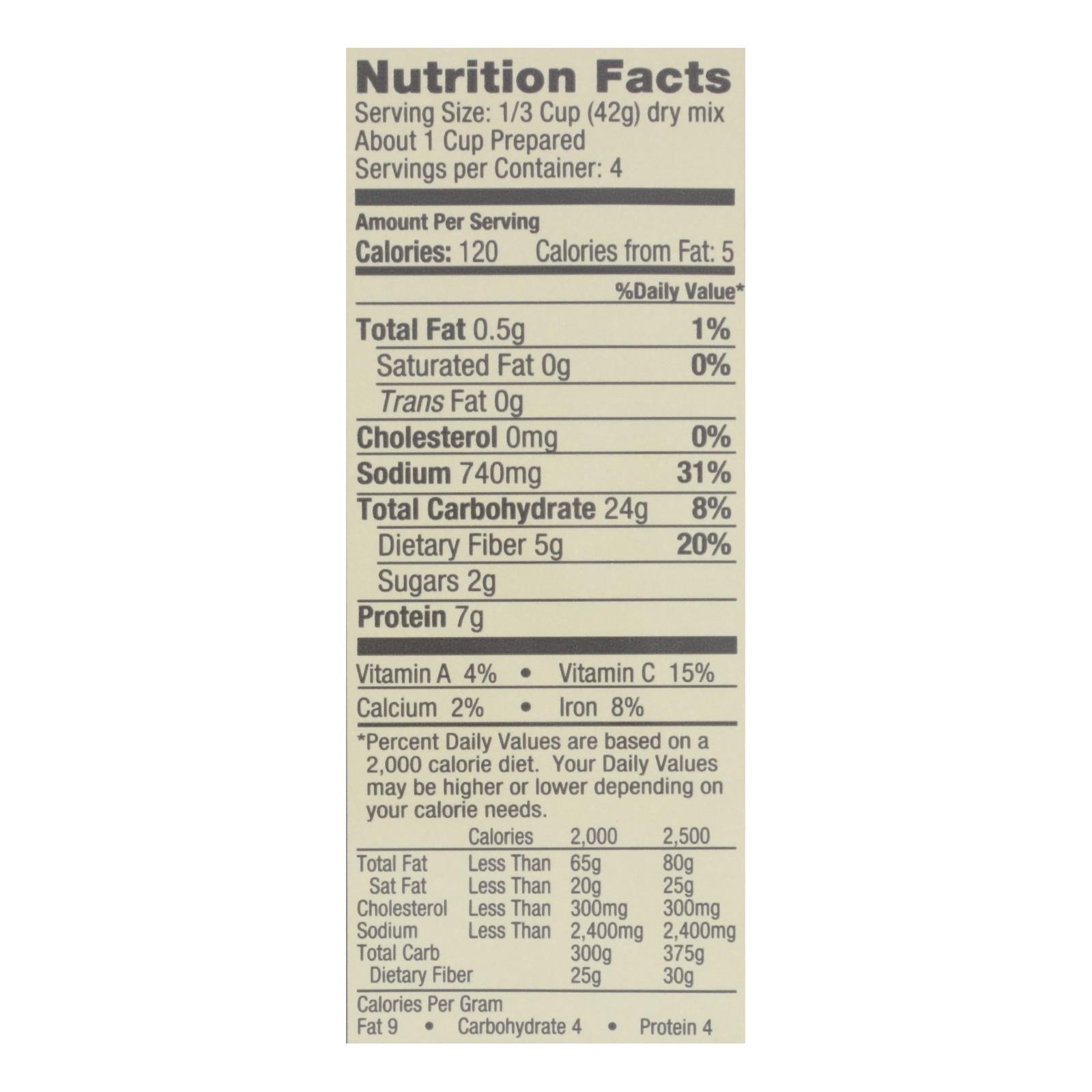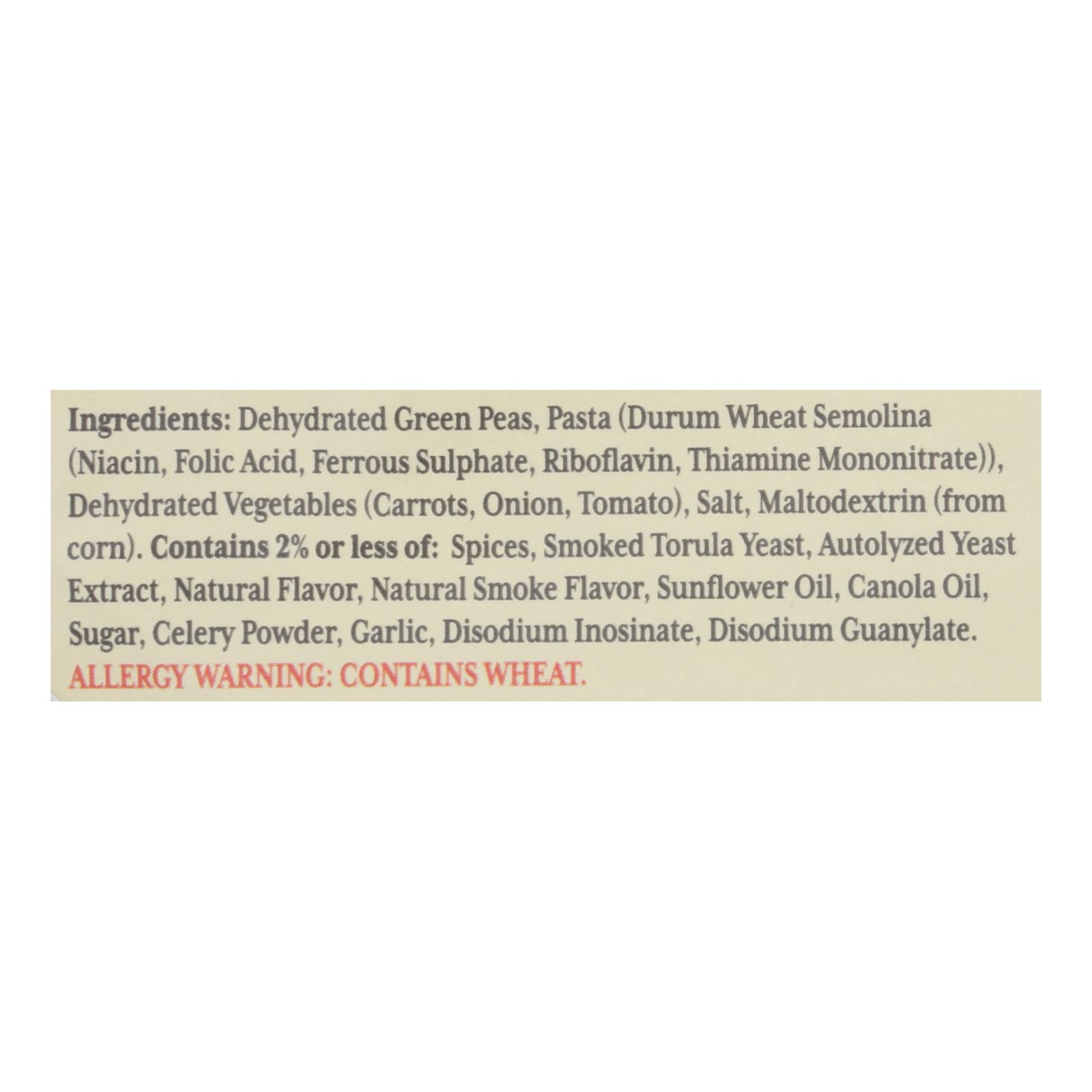 ingredients : dehydrated green peas;pasta;durum wheat semolina;niacin;folk acid;ferrous sulphate;riboflavin;thiamine mononitrate;dehydrated vegetables;carrots;onion;tomato;salt;maltodextrin;from corn;contains 2% or less of: spices;smoked torula yeast;autolyzed yeast extract;natural flavor;natural smoke flavor;sunflower oil;canola oil;sugar;celery powder;garlic;disodium inosinate;disodium guanylate