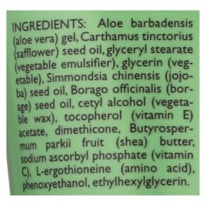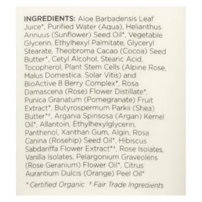 ingredients : aloe barbadensis leaf juice;purified water;aqua;helianthus annuus;sunflower;seed oil;vegetable glycerin;ethylhexyl palmitate;glyceryl stearate;theobroma cacao;cocoa;seed butter;cetyl alcohol;stearic acid;tocopherol;fruit stem cells;malus domestica;solar vitis;and bioactive 8 berry complex;citrus reticulate;mandarin;fruit extract;butyrospermum parkii;shea;butter*†;argania spinosa;argan;kernel oil;allantoin;ethylhexylglycerin;panthenol;xanthan gum;algin;rosa canina;rosehip;aspalathus linearis;rooi