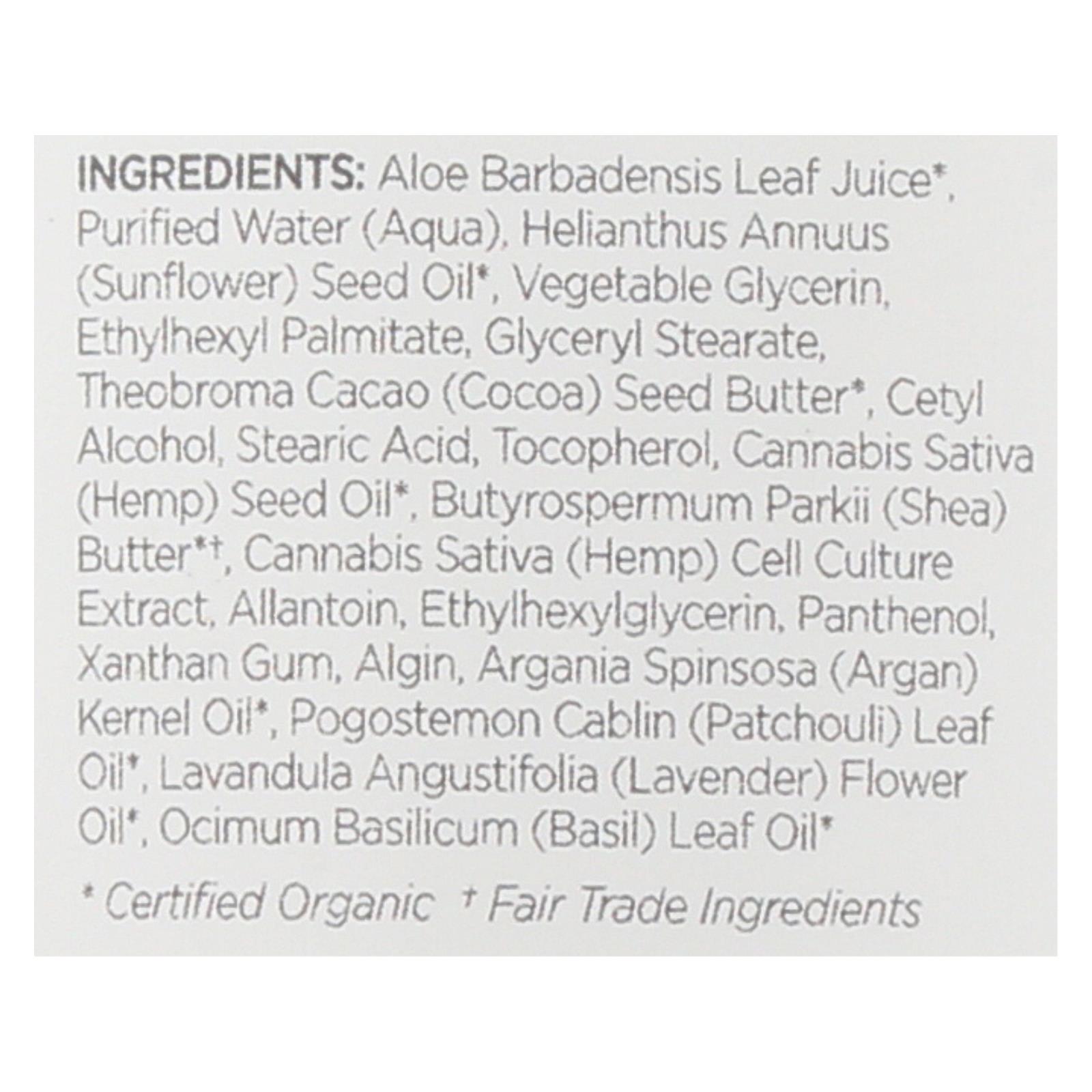 ingredients : aloe barbadensis leaf juice;purified water;aqua;helianthus annuus;sunflower;seed oil;vegetable glycerin;ethylhexyl palmitate;glyceryl stearate;theobroma cacao;cocoa;seed butter;cetyl alcohol;stearic acid;tocopherol;cannabis sativa;hemp;butyrospermum parkii;shea;butter*†;cell culture extract;allantoin;ethylhexylglycerin;panthenol;xanthan gum;algin;argania spinsosa;argan;kernel oil;pogostemon cablin;patchouli;leaf oil;lavandula angustifolia;lavender;flower oil;ocimum basilicum;basil