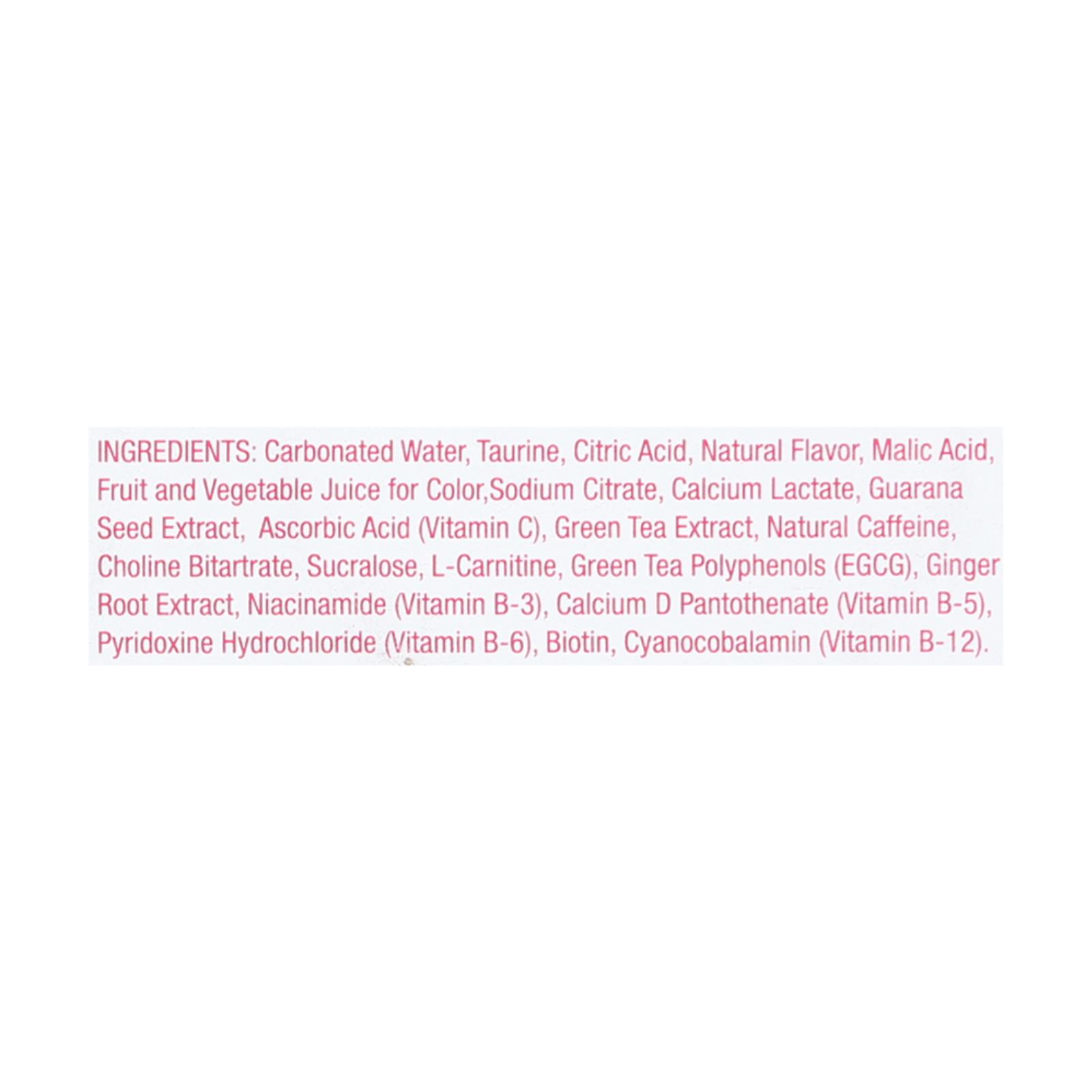 ingredients : carbonated water, taurine, citric acid, natural flavor, malic acid, fruit and vegetable juice for color, sodium citrate, calcium lactate, guarana seed extract, ascorbic acid (vitamin c), green tea extract, natural caffeine, choline bitartrate, sucralose, l-carnitine, green tea polyphenols (egcg), ginger root extract, niacinamide (vitamin b-3), calcium d pantothenate (vitamin b-5), pyridoxine hydrochloride (vitamin b-6), biotin, cyanocobalamin (vitamin b-12).