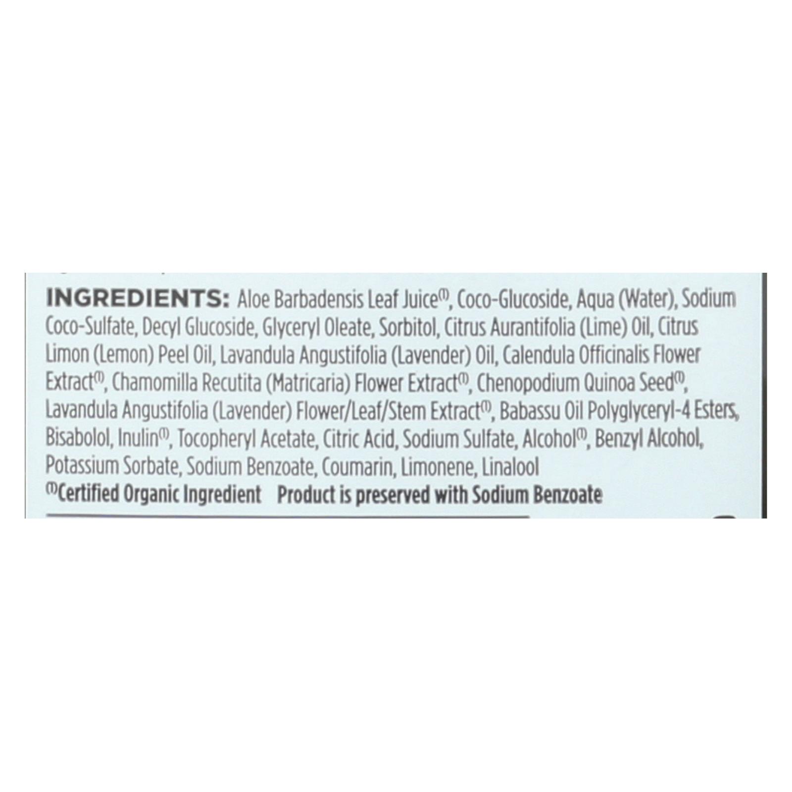 ingredients : aloe barbadensis leaf juice;¹;coco-glucoside;aqua;water;sodium coco-sulfate;decyl glucoside;glyceryl oleate;sorbitol;citrus aurantifolia;lime;oil;citrus limon;lemon;peel oil;lavandula angustifolia;lavender;calendula officinalis lower extract;chamomilla recutita;matricaria;flower extract;chenopodium quinoa seed;flower/leaf/stem extract;babassu oil polygyceryl-4 esters;bisabolol;inulin;tocopheryl acetate;citric acid;sodium sulfate;alcohol;benzyl alcohol;potassium sorbate;sodium benzoate;coumarin;l