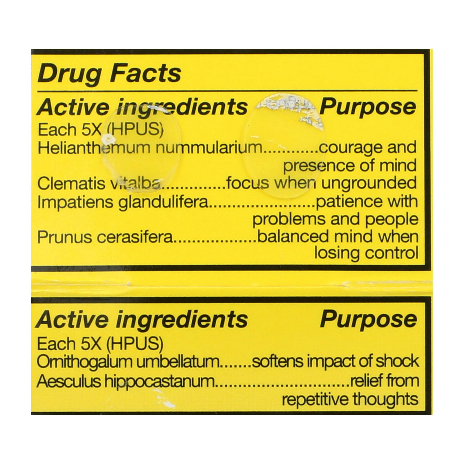 ingredients : alcohol;each 5x;hpus;white chestnut;aesculus hippocastanum;purpose relief from repetitive thoughts rock rose;helianthemum nummularium;purpose courage and presence of mind clematis;clematis vitalba;purpose focus when ungrounded impatiens;impatiens glandulifera;purpose patience with problems and people cherry plum;prunus cerasifera;purpose balanced mind when losing control star of bethlehem;ornithogalum umbellatum;purpose softens impact of shock