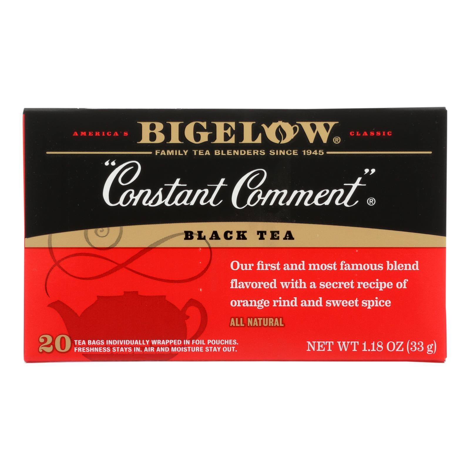 Bigelow tea premium tea, constant comment is a blend of black tea with orange rind and sweet spices. This product is still exclusively produced by bigelow tea, one sip and you will know there is no tea like it. According to the caff-o-meter, bigelow tea premium tea, constant comment, contains 30-60 mg. Of caffeine per serving. What makes this product so special is that bigelow tea uses only hand-picked tea from the highest elevation gardens before gently processing it to bring out the natural flavor of their teas. Every box of bigelow tea premium tea, constant comment, contains 20 tea bags.