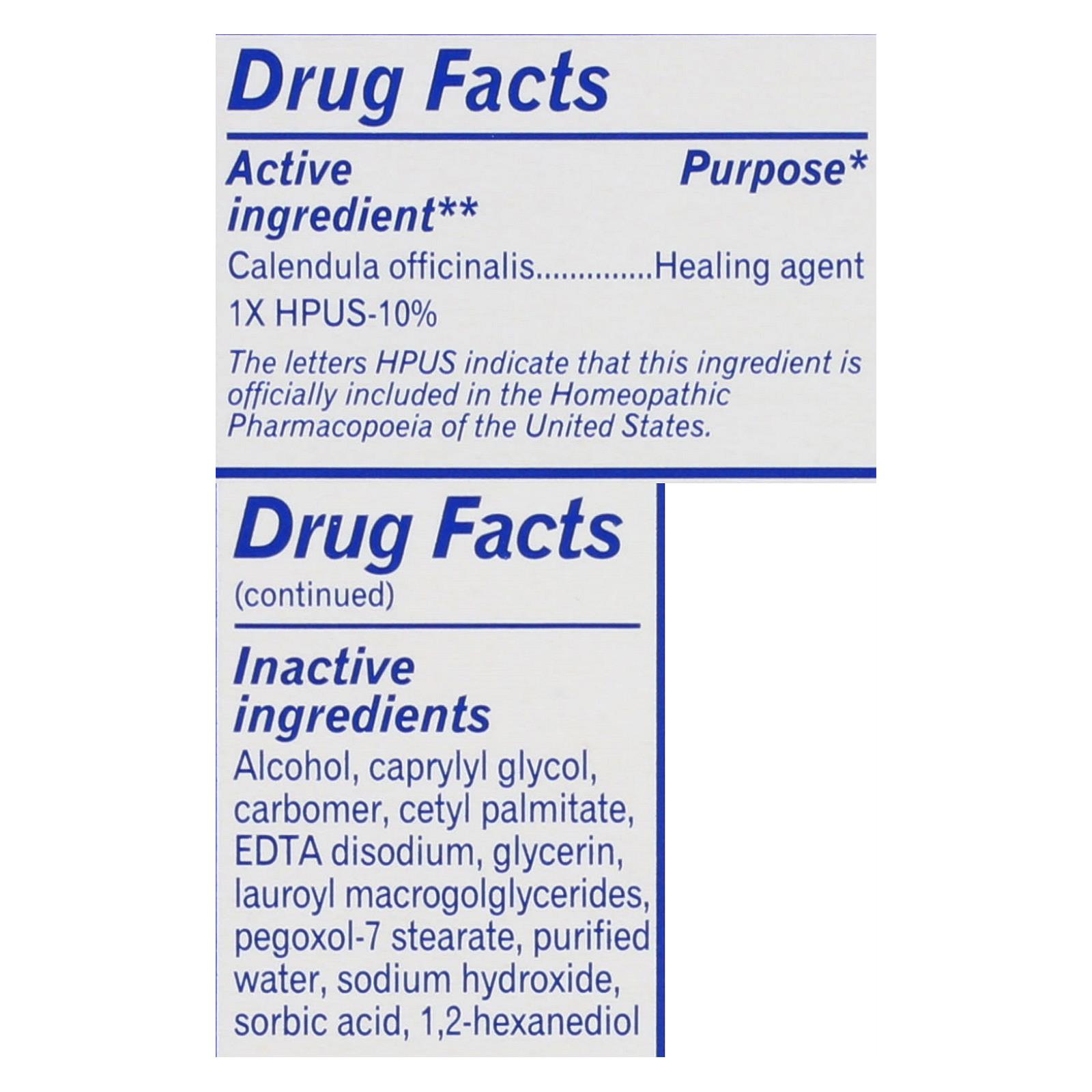 ingredients : active ingredient** purpose* calendula officinalis 1x hpus-10% healing agent inactive alcohol;caprylyl glycol;carbomer;cetyl palmitate;edta disodium;glycerin;lauroyl macrogolglycerides;pegaxol-7 stearate;purified water;sodium hydroxide;sorbic acid;1;2-hexanediol