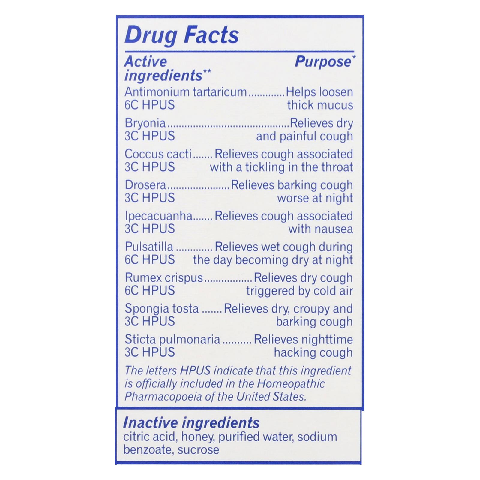 ingredients : active ** antimonium tartaricum 6c hpus purpose* helps loosen thick mucus bryonia 3c hpus relieves dry and painful cough coccus cacti 3c hpus relieves cough associated with a tickling in the throat drosera 3c hpus relieves barking cough worse at night ipecacuanha 3c hpus relieves cough associated with nausea pulsatilla 6c hpus relieves wet cough during the day becoming dry at night rumex crispus 6c hpus relieves dry cough triggered by cold air spongia tosta 3c hpus relieves dry;croupy and barki