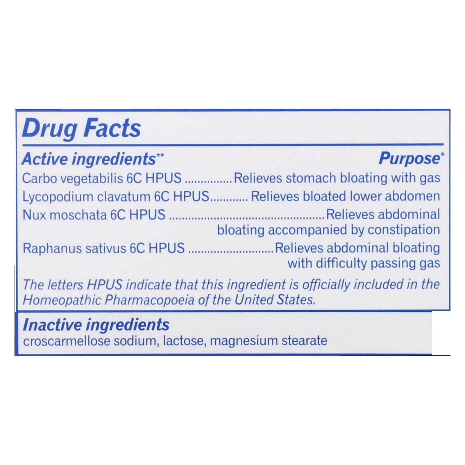ingredients : active ** carbo vegetabilis 6c hpus purpose* relieves stomach bloating with gas lycopodium clavatum 6c hpus purpose* relieves bloated lower abdomen nux moschata 6c hpus purpose* relieves abdominal bloating accompanied by constipation raphanus sativus 6c hpus purpose* relieves abdominal bloating with difficulty passing gas inactive croscarmellose sodium;lactose;magnesium stearate