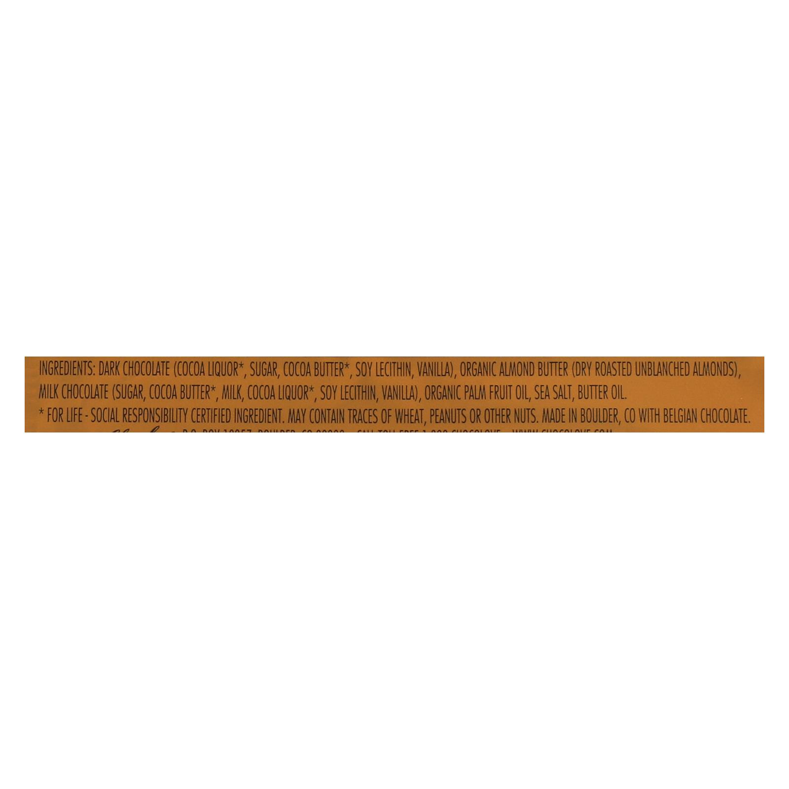 ingredients : dark chocolate (cocoa liquor**, sugar, cocoa butter**, soy lecithin and/or sunflower lecithin, vanilla);almond butter (dry roasted unblanched almonds);milk chocolate (sugar, cocoa butter**, milk, cocoa liquor**, soy lecithin and/or sunflower lecithin, vanilla);organic palm fruit oil;organic butter oil;sea salt;sunflower lecithin