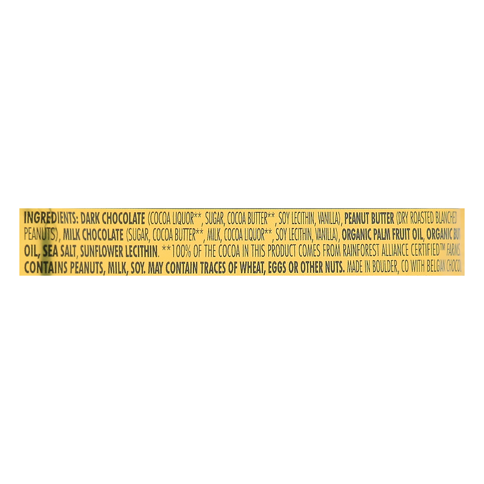 ingredients : dark chocolate (cocoa liquor**, sugar, cocoa butter**, soy lecithin and/or sunflower lecithin, vanilla);peanut butter (dry roasted blanched peanuts);milk chocolate (sugar, cocoa butter**, milk, cocoa liquor**, soy lecithin and/or sunflower lecithin, vanilla);organic palm fruit oil;organic butter oil;sea salt;sunflower lecithin