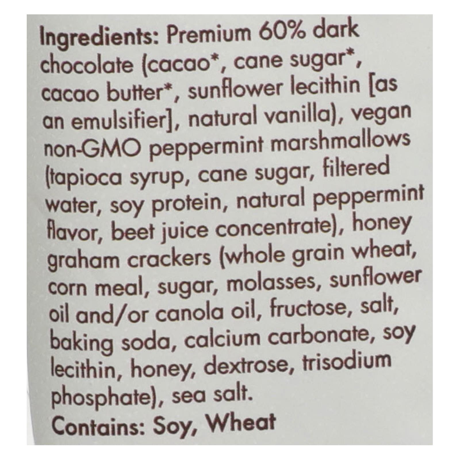 ingredients : premium 60% dark chocolate;cacao;cane sugar;cacao butter;sunflower lecithin [as an emulsifier];natural vanilla;vegan non-gmo peppermint marshmallows;tapioca syrup;filtered water;soy protein;natural peppermint flavor;beet juice concentrate;honey graham crackers;whole grain wheat;corn meal;sugar;molasses;sunflower oil and/or canola oil;fructose;salt;baking soda;calcium carbonate;soy lecithin;honey;dextrose;trisodium phosphate;sea salt