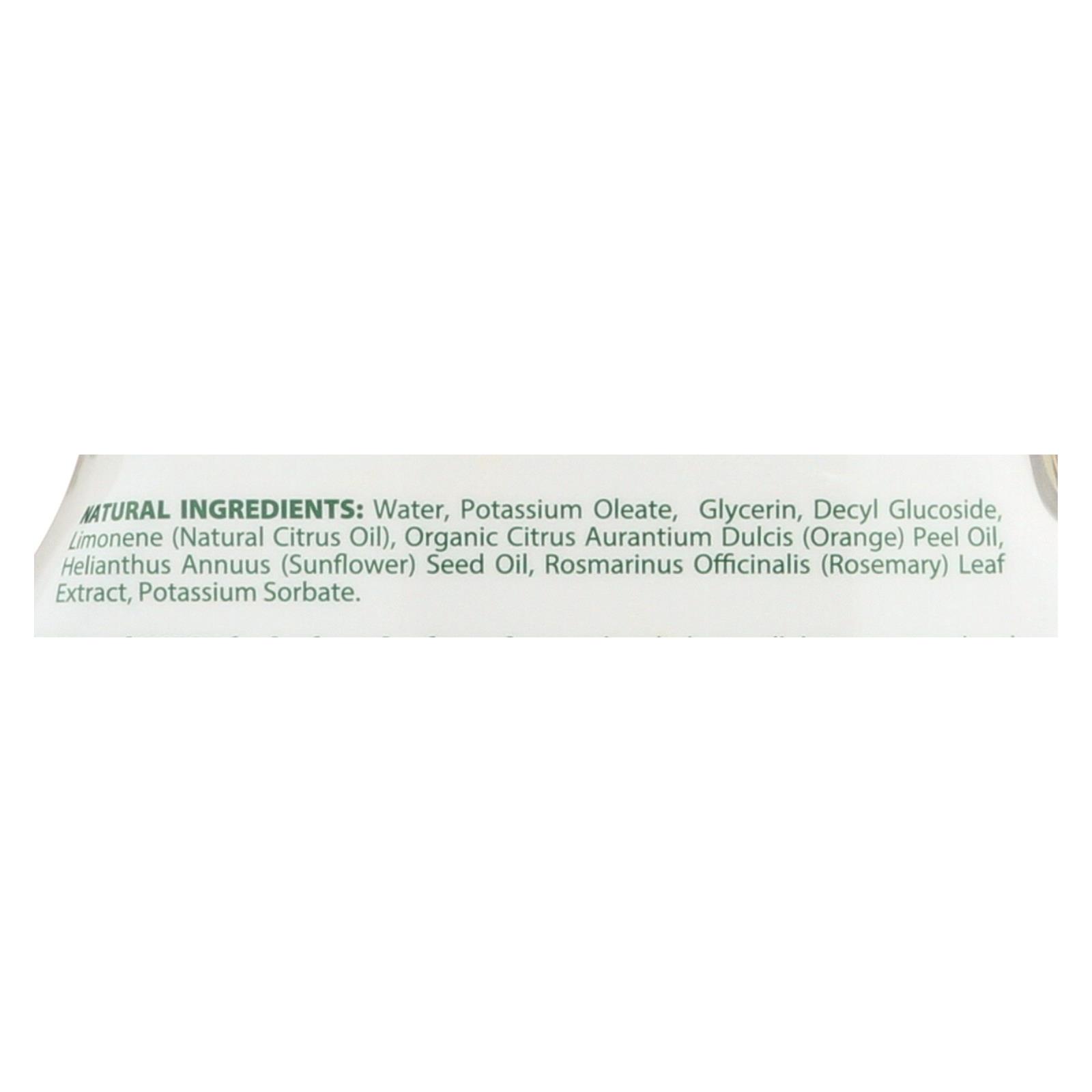 ingredients : water;potassium oleate;glycerin;decyl glucoside;limonene;natural citrus oil;organic citrus aurantium dulcis;orange;peel oil;helianthus annuus;sunflower;seed oil;rosmarinus officinalis;rosemary;leaf extract;potassium sorbate