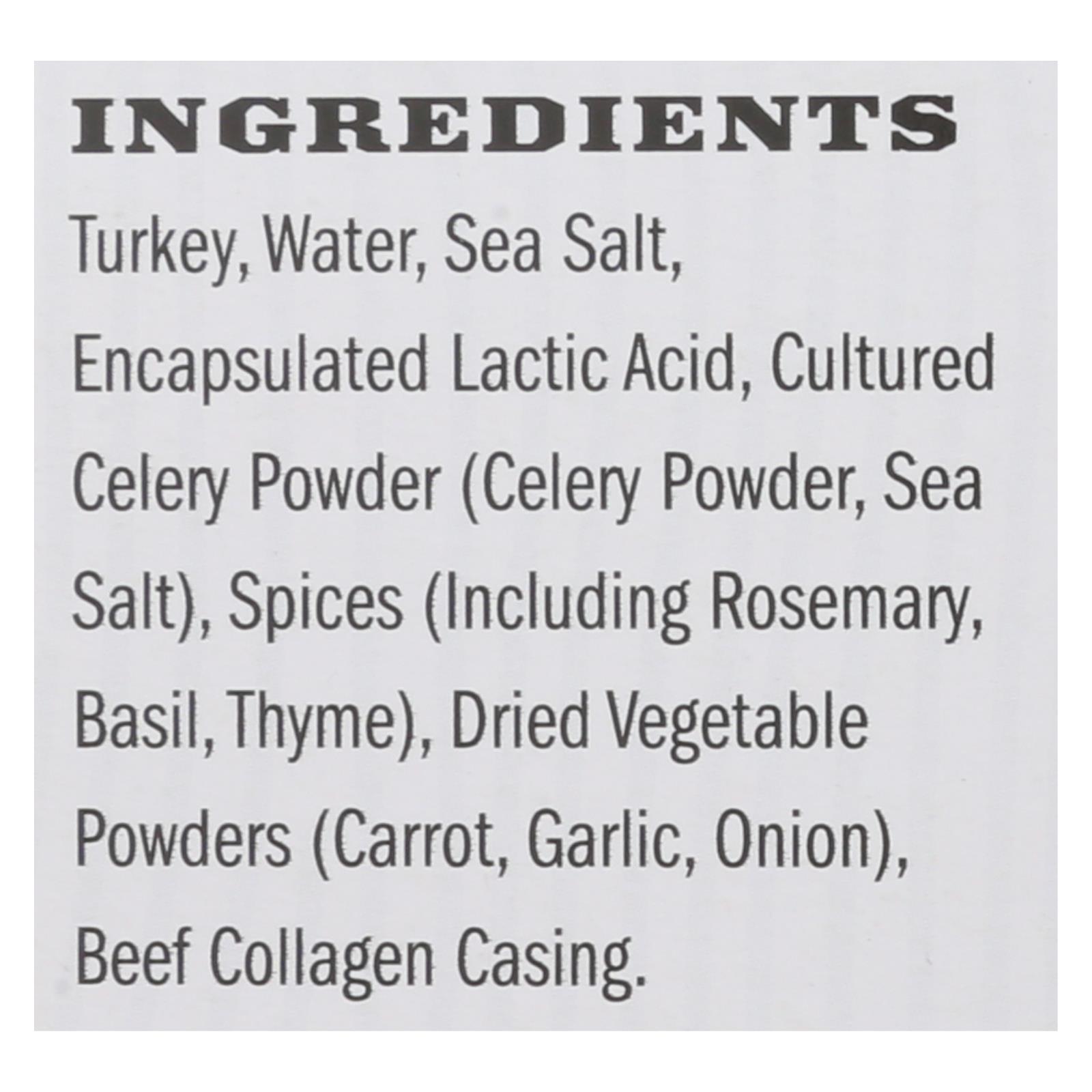 ingredients : turkey;water;sea salt;encapsulated lactic acid;cultured celery powder;celery powder;spices;including rosemary;basil;thyme;dried vegetable powders;carrot;garlic;onion;cherry;powder;colored beef;collagen casing;paprika;beta-carotene