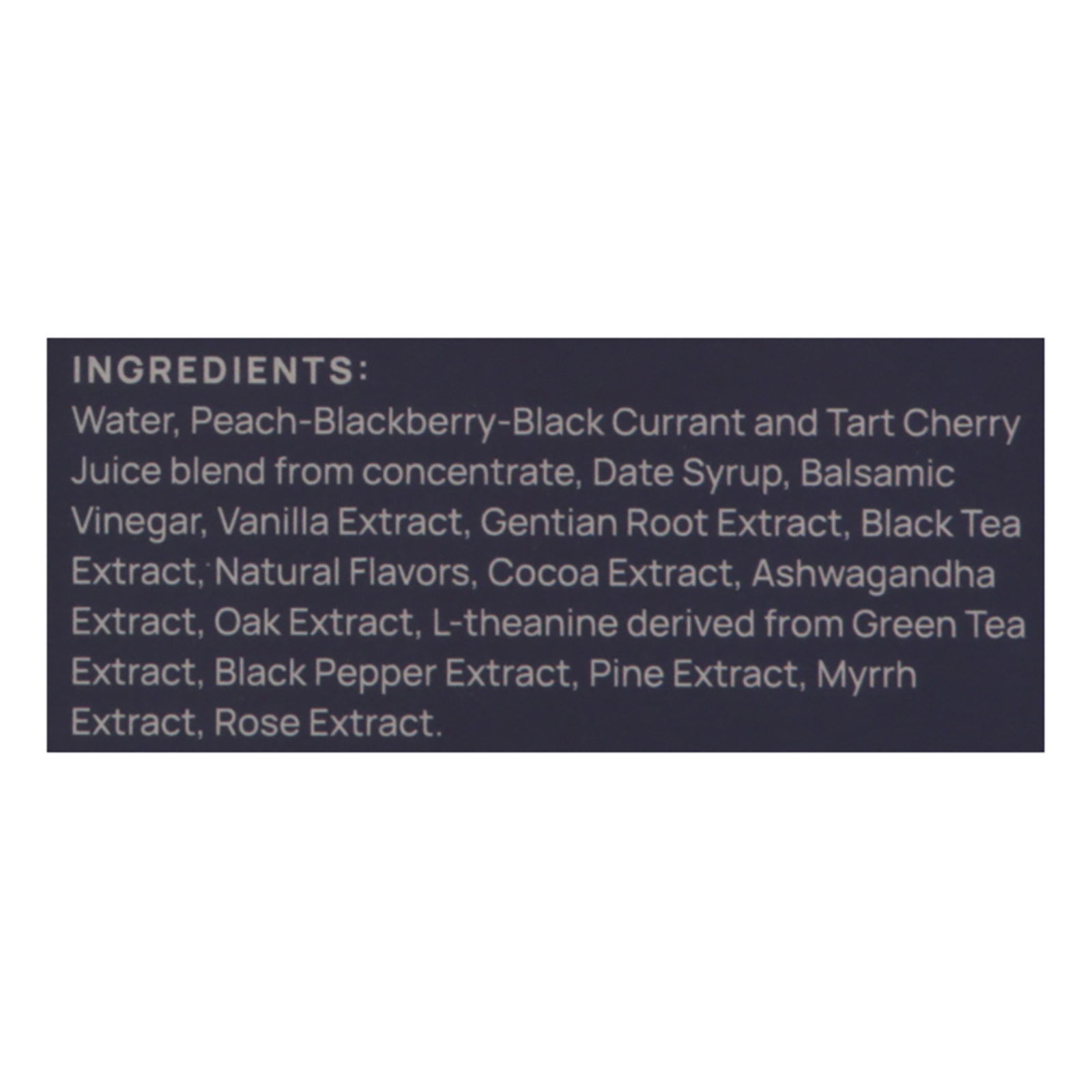 ingredients : water;peach-blackberry-black currant and tart cherry juice blend from concentrate;date syrup;balsamic vinegar;vanilla extract;gentian root extract;black tea extract;natural flavors;cocoa extract;ashwagandha extract;oak extract;l-theanine derived from green tea extract;black pepper extract;pine extract;myrrh extract;rose extract