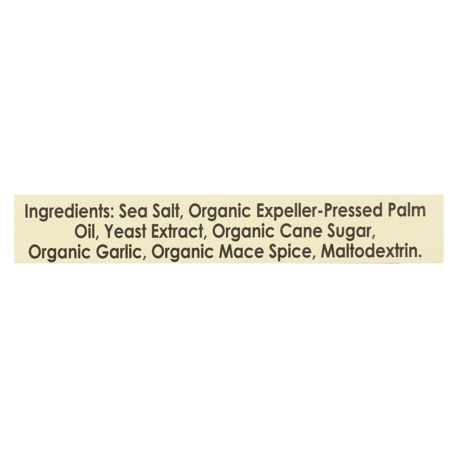 ingredients : sea salt;organic expeller-pressed palm oil;yeast extract;organic cane sugar;organic garlic;organic mace spice;maltodextrin