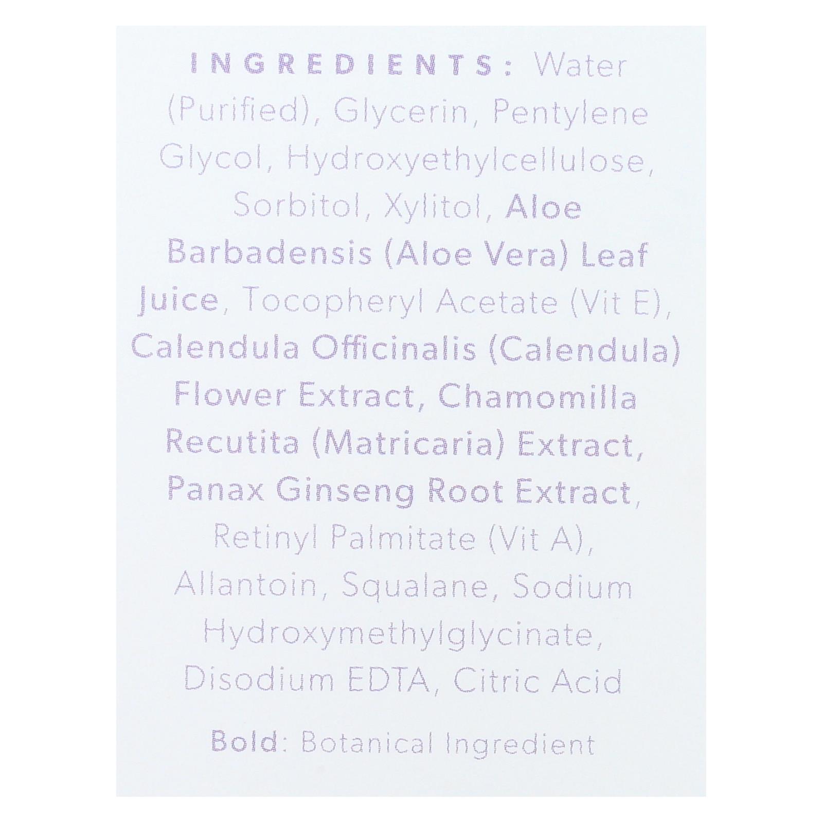 ingredients : water;purified;glycerin;pentylene glycol;hydroxyethylcellulose;sorbitol;xylitol;aloe barbadensis;aloe vera;leaf juice;tocopheryl acetate;vit e;calendula officinalis;calendula;flower extract;chamomilla recutita;matricaria;extract;panax ginseng root extract;retinyl palmitate;vit a;allantoin;squalane;sodium hydroxymethylglycinate;disodium edta;citric acid