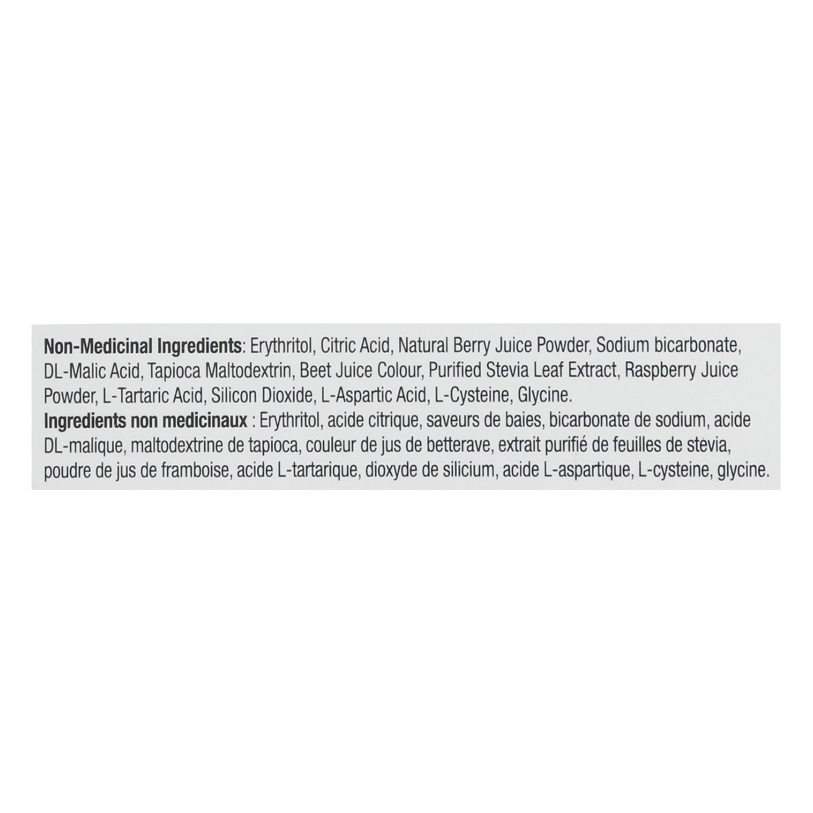 ingredients : non-medicinal: erythritol, citric acid, natural berry juice powder, sodium bicarbonate, dl-malic acid, tapioca maltodextrin, beet juice colour, purified stevia leaf extract, raspberry juice powder, l-tartaric acid, silicon dioxide, l-aspartic acid, l-cysteine, glycine