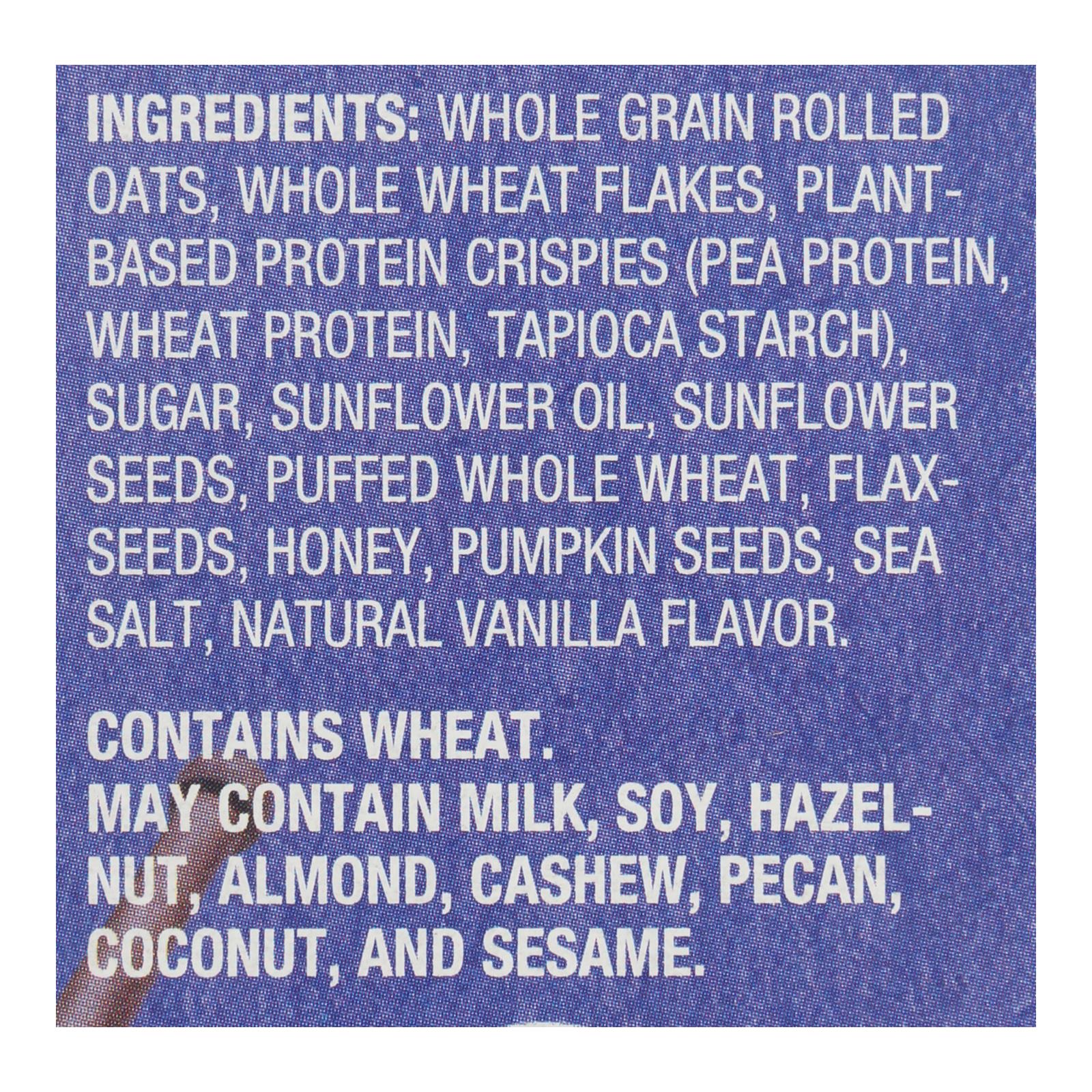ingredients : whole grain rolled oats;whole wheat flakes;plant-based protein crispies (pea protein, wheat protein, tapioca starch);sugar;sunflower oil;sunflower seeds;puffed whole wheat;flax-seeds;honey;pumpkin seeds;sea salt;natural vanilla flavor