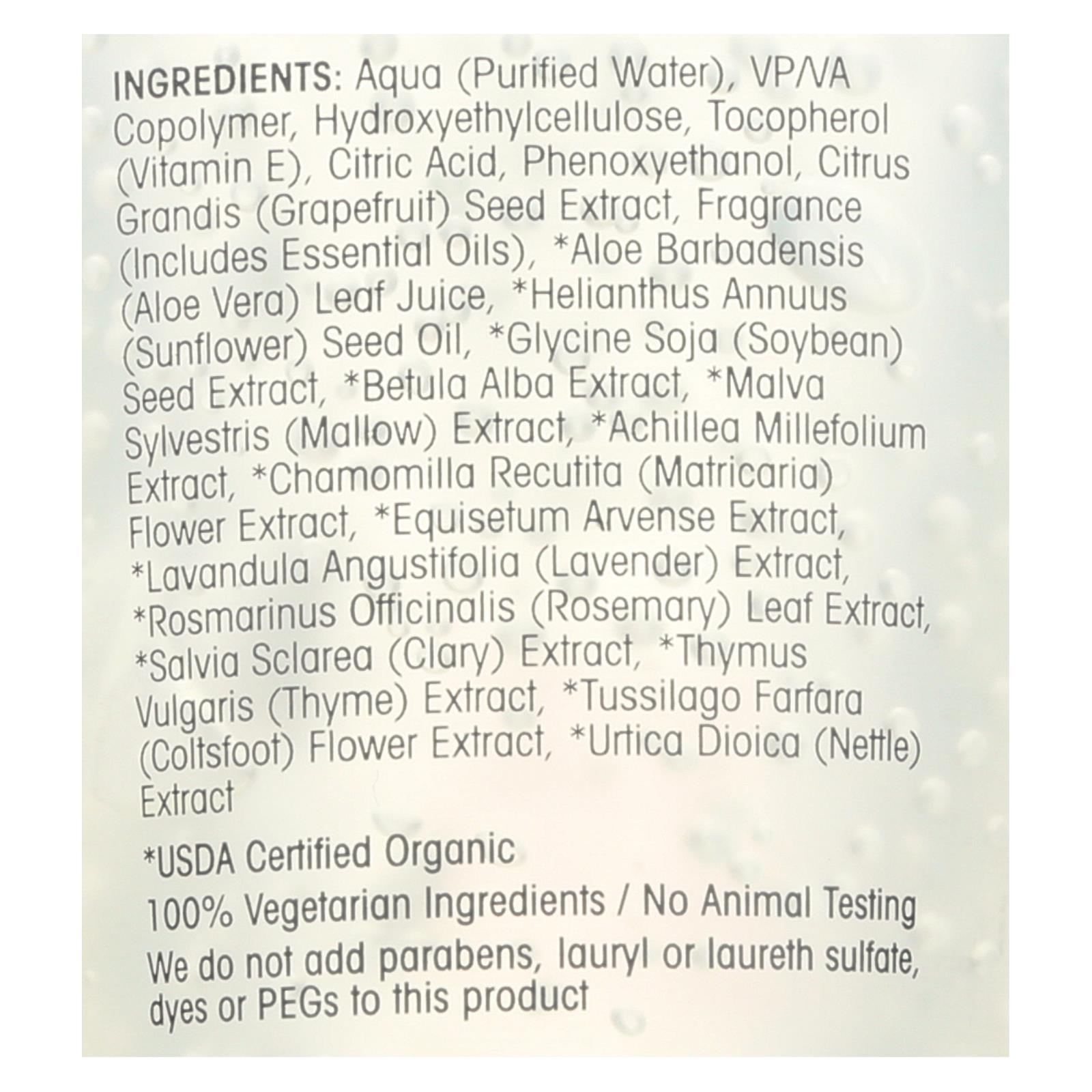 ingredients : aqua;purified water;vp/va copolymer;hydroxyethylcellulose;tocopherol;vitamin e;citric acid;phenoxyethanol;citrus grandis;grapefruit;seed extract;fragrance;includes essential oils;aloe barbadensis;aloe vera;leaf juice;helianthus annuus;sunflower seed oil;glycine soja;soybean;betula alba extract;malva sylvestris;mallow;extract;achillea millefolium extract;chamomilla recutita;matricaria;flower extract;equisetum arvense extract;lavandula angustifolia;lavender;rosmarinus officinalis;rosemary;leaf ext