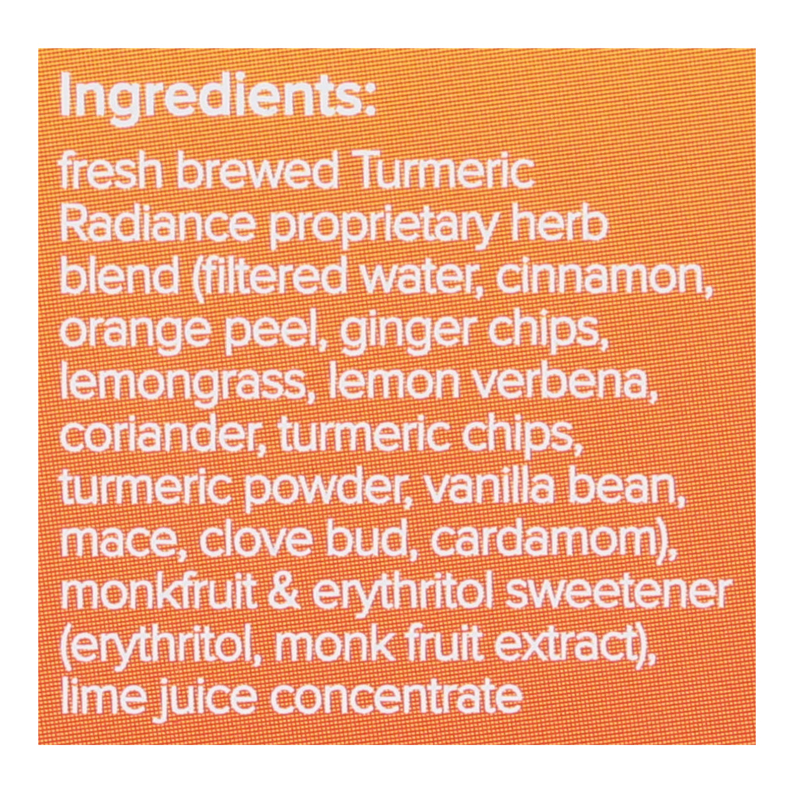 ingredients : water (reverse osmosis);lime juice concentrate;turmeric radiance proprietary herb bend (ginger, cinnamon, lemon verbena, lemongrass, orange peel, coriander, turmeric chips, turmeric powder, mace, cardamom, cloves, vanilla bean);monk fruit extract;naturally occurring erythritol