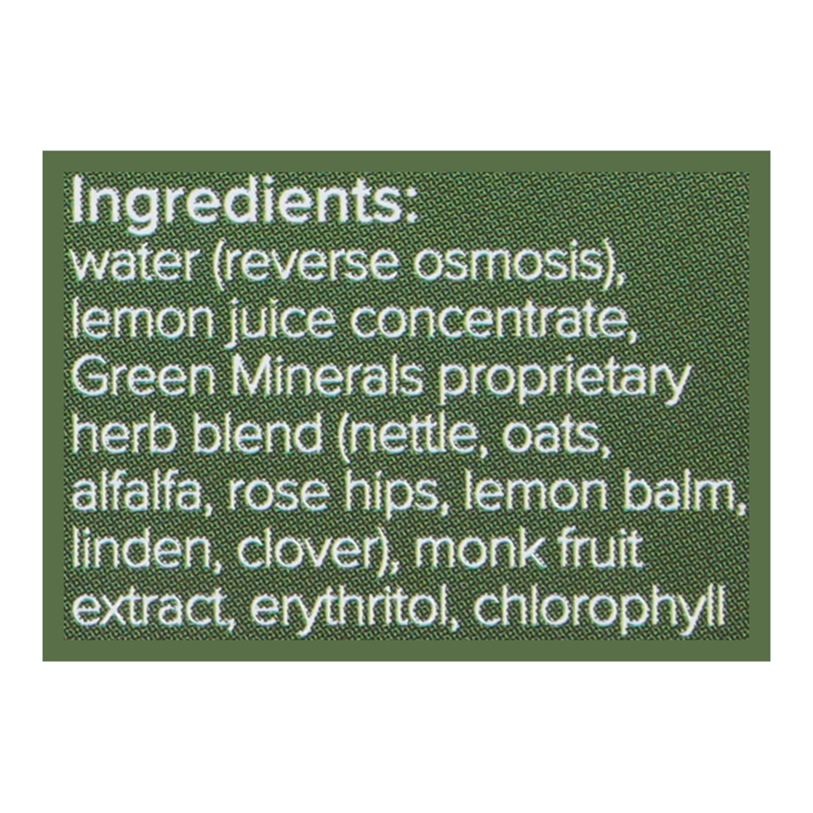 ingredients : water (reverse osmosis);lemon juice concentrate;green minerals proprietary herb blend (nettle, oats, alfalfa, rose hips, lemon balm, linden, clover);monk fruit extract;erythritol;chlorophyll