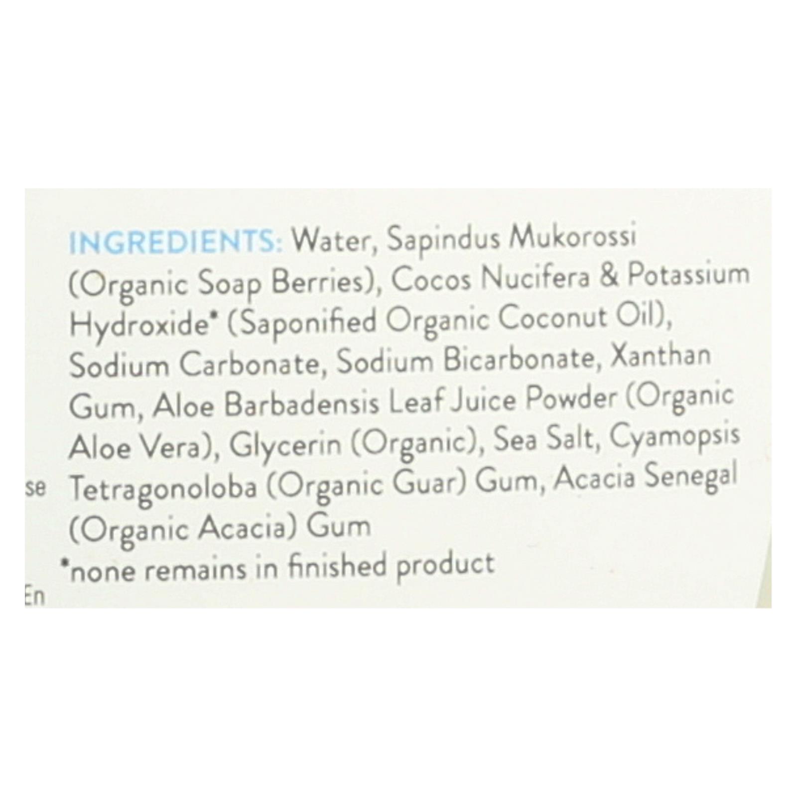 ingredients : water;sapindus mukorossi;organic soap berries;cocos nucifera & potassium hydroxide;saponified organic coconut oil;sodium carbonate;sodium bicarbonate;xanthan gum;aloe barbadensis leaf juice powder;organic aloe vera;glycerin;organic;sea salt;cyamopsis tetragonoloba;organic guar;gum;acacia senegal;organic acacia
