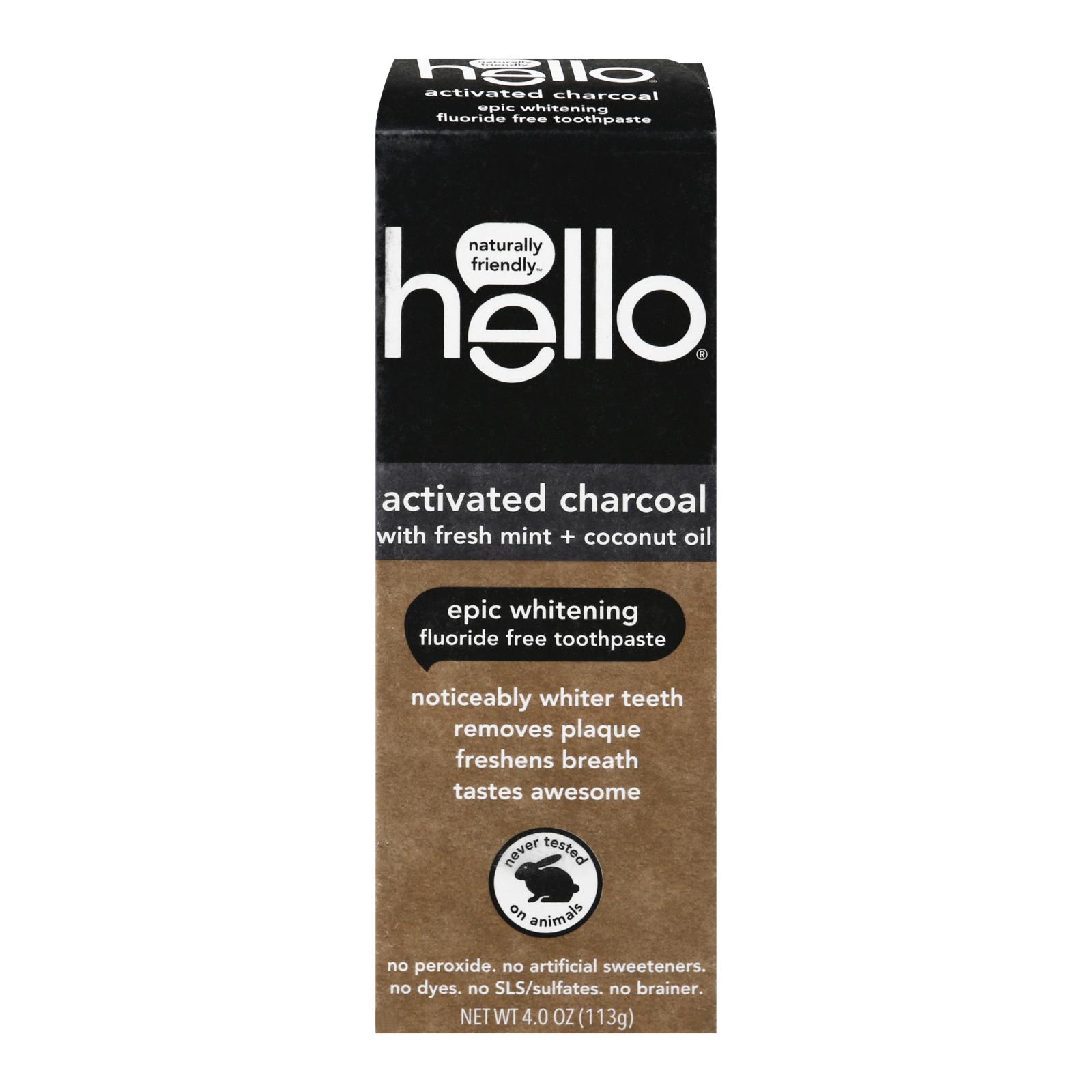 Activated charcoal with fresh mint + coconut oil. No artificial flavors. Vegan. Naturally friendly. Noticeably whiter teeth. Removes plaque. Freshens breath. Tastes awesome. No peroxide. No artificial sweeteners. No dyes. No sls/sulfates. No brainer. What’s up with charcoal? black paste might look weird but it works brilliantly. Activated charcoal (made from sustainable bamboo) is nature’s way to epically whiten teeth and freshen your breath like nobody’s business. For maximum friendliness, use every time you brush. Please spit responsibly, and clean the sink after each use. (hashtag)brushhappy. Black paste works brilliantly. No preservatives. No parabens. No fluoride. Let’s be friends. Www.helloproducts.com learn more and smile more at helloproducts.com. Our tubes are bpa-free + contain no phthalates. Bonus. Never tested on animals. Leaping bunny certified. 100% recyclable paperboard + printed with soy inks. Globally sourced ingredients + made in the usa. Rock on.