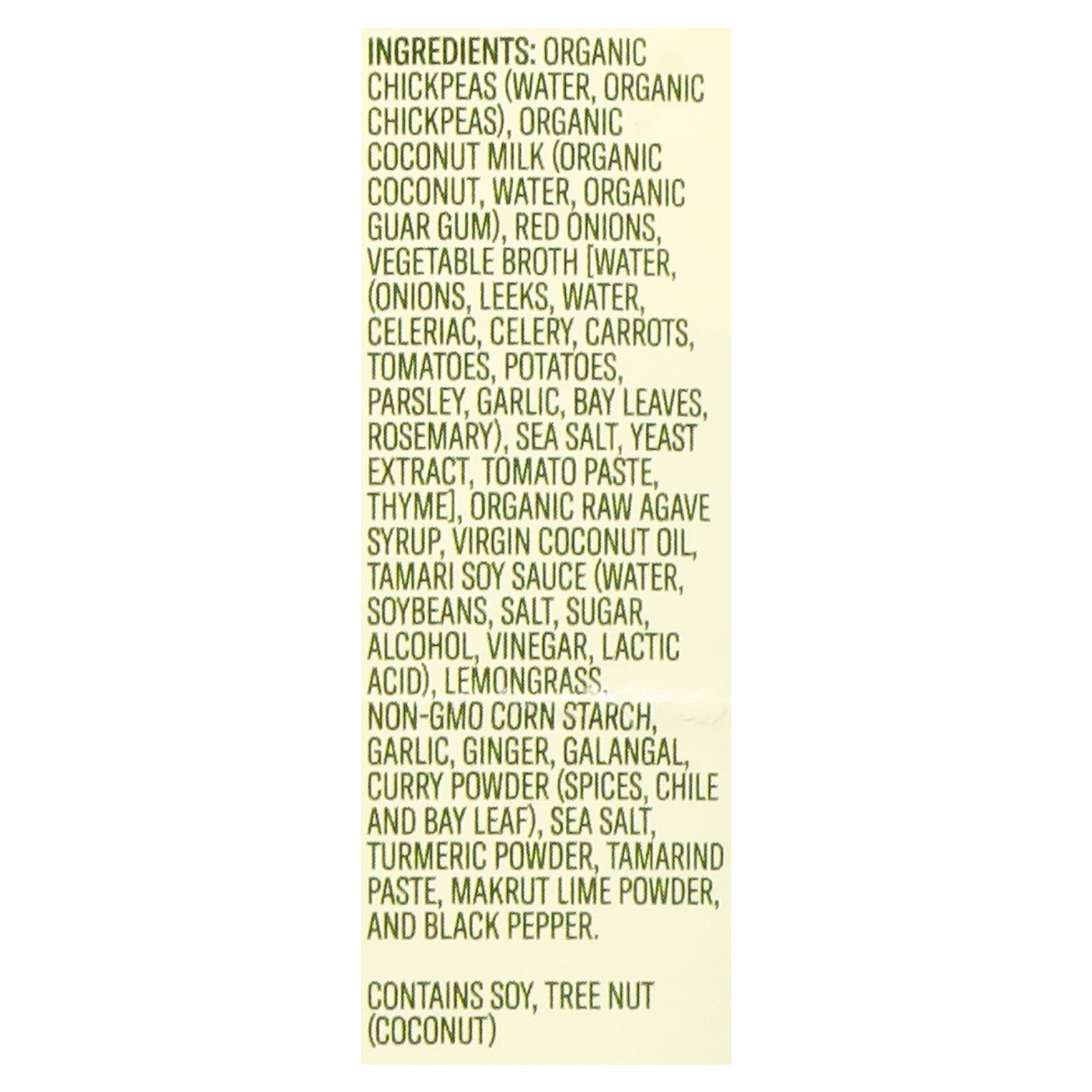 ingredients : organic chickpeas (water, organic chickpeas);organic coconut milk (organic coconut, water, organic guar gum);red onions;vegetable broth [water, (onions, leeks, water, celeriac, celery, carrots, tomatoes, potatoes, parsley, garlic, bay leaves, rosemary), sea salt, yeast extract, tomato paste, thyme];organic raw agave syrup;virgin coconut oil;tamari soy sauce (water, soybeans, salt, sugar, alcohol, vinegar, lactic acid);lemongrass;non-gmo corn starch;garlic;ginger;galangal;curry powder (spices, ch