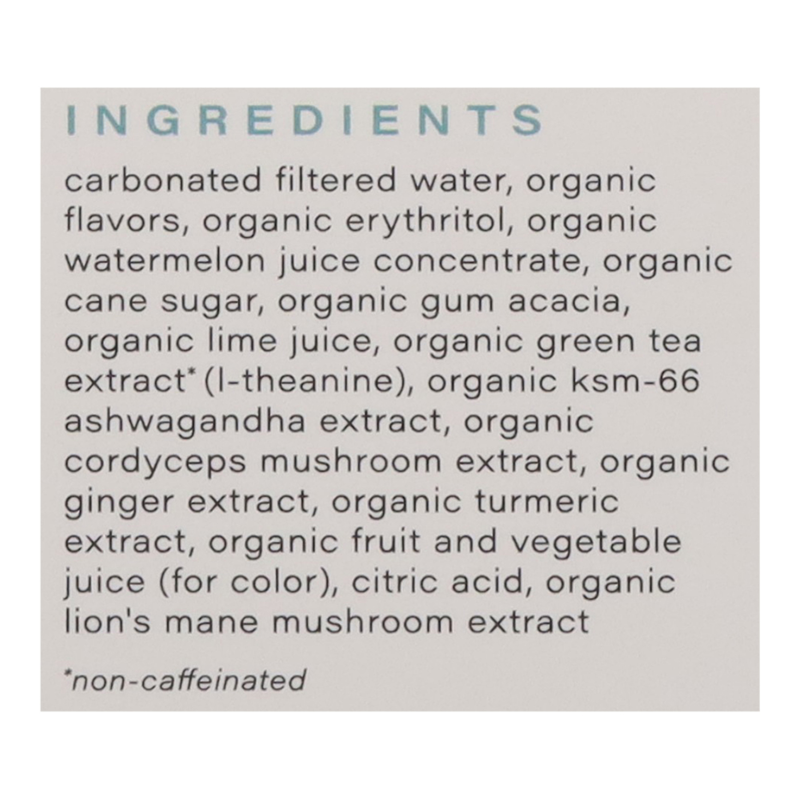ingredients : carbonated filtered water;organic flavors;organic erythritol;organic watermelon juice concentrate;organic cane sugar;organic gum acacia;organic lime juice;organic green tea extract* (l-theanine);organic ksm-66 ashwagandha extract;organic cordyceps mushroom extract;organic ginger extract;organic turmeric extract;organic fruit and vegetable juice (for color);citric acid;organic lion’s mane mushroom extract