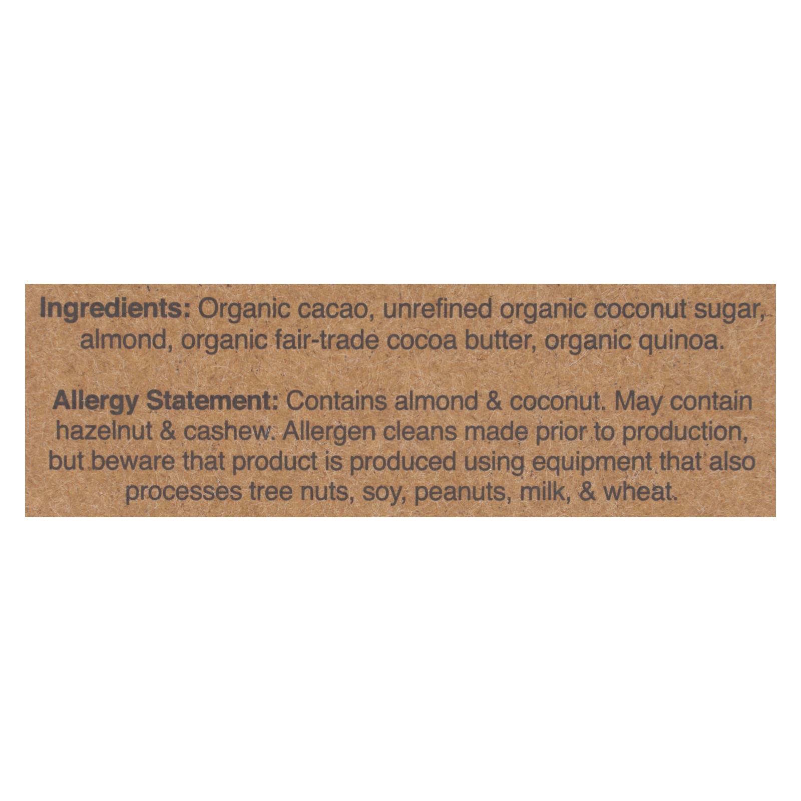 ingredients : organic cacao;unrefined organic coconut sugar;almond;organic fair-trade cocoa butter;organic quinoa