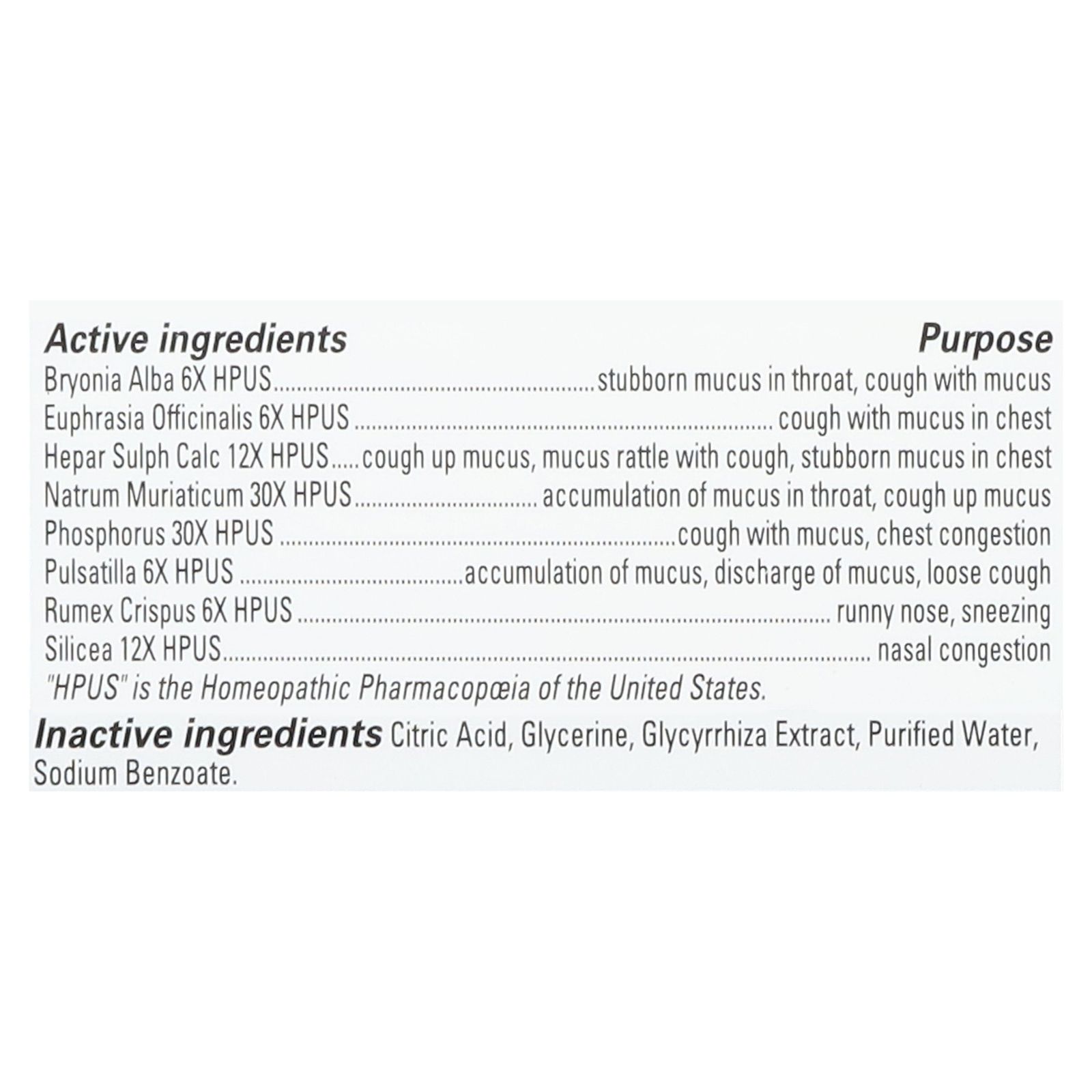 ingredients : bryonia alba 6x hpus purpose stubborn mucus in throat;cough with mucus euphrasia officinalis 6x hpus purpose cough with mucus in chest hepar sulph calc 12x hpus purpose cough up mucus;mucus rattle with cough;stubborn mucus in chest natrum muriaticum 30x hpus purpose accumulation of mucus in throat;cough up mucus phosphorus 30x hpus purpose cough with mucus;chest congestion pulsatilla 6x hpus purpose accumulation of mucus;discharge of mucus;loose cough rumex crispus 6x hpus purpose runny nose;sne