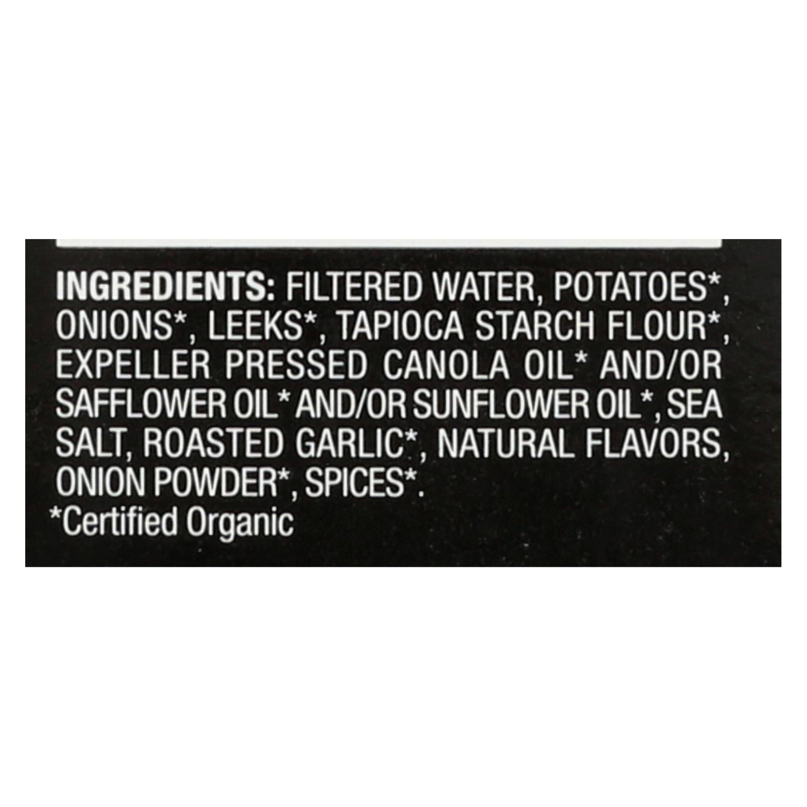 ingredients : filtered water;potatoes;onions;leeks;tapioca starch flour;expeller pressed canola oil* and/or safflower oil* and/or sunflower oil;sea salt;roasted garlic;natural flavors;onion powder;spices