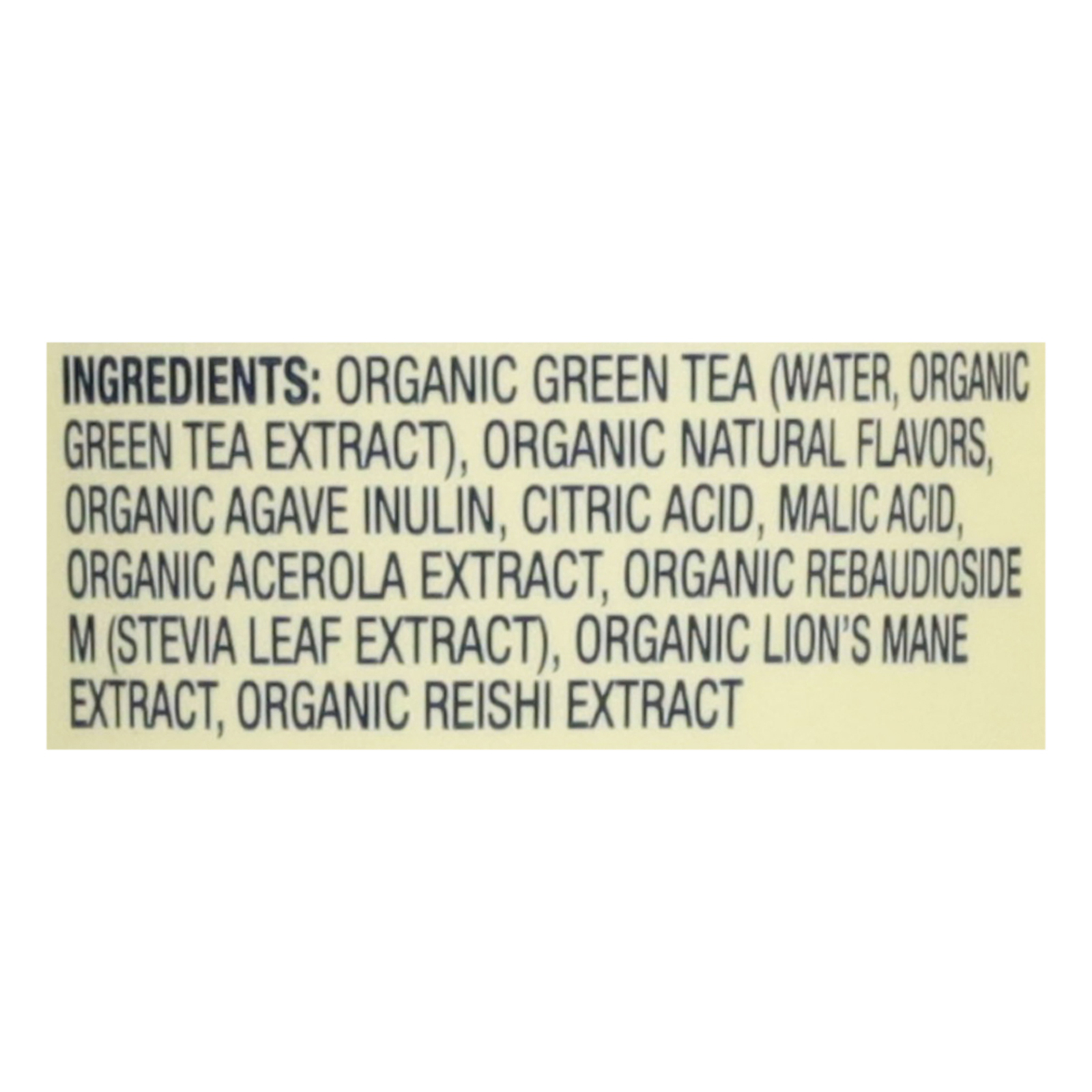 ingredients : organic green tea (water, organic green tea extract);organic natural flavors;organic agave inulin;organic citric acid;organic malic acid;organic acerola extract;organic rebaudioside m (stevia leaf extract);organic ashwagandha extract;organic lion’s mane extract;organic reishi extract
