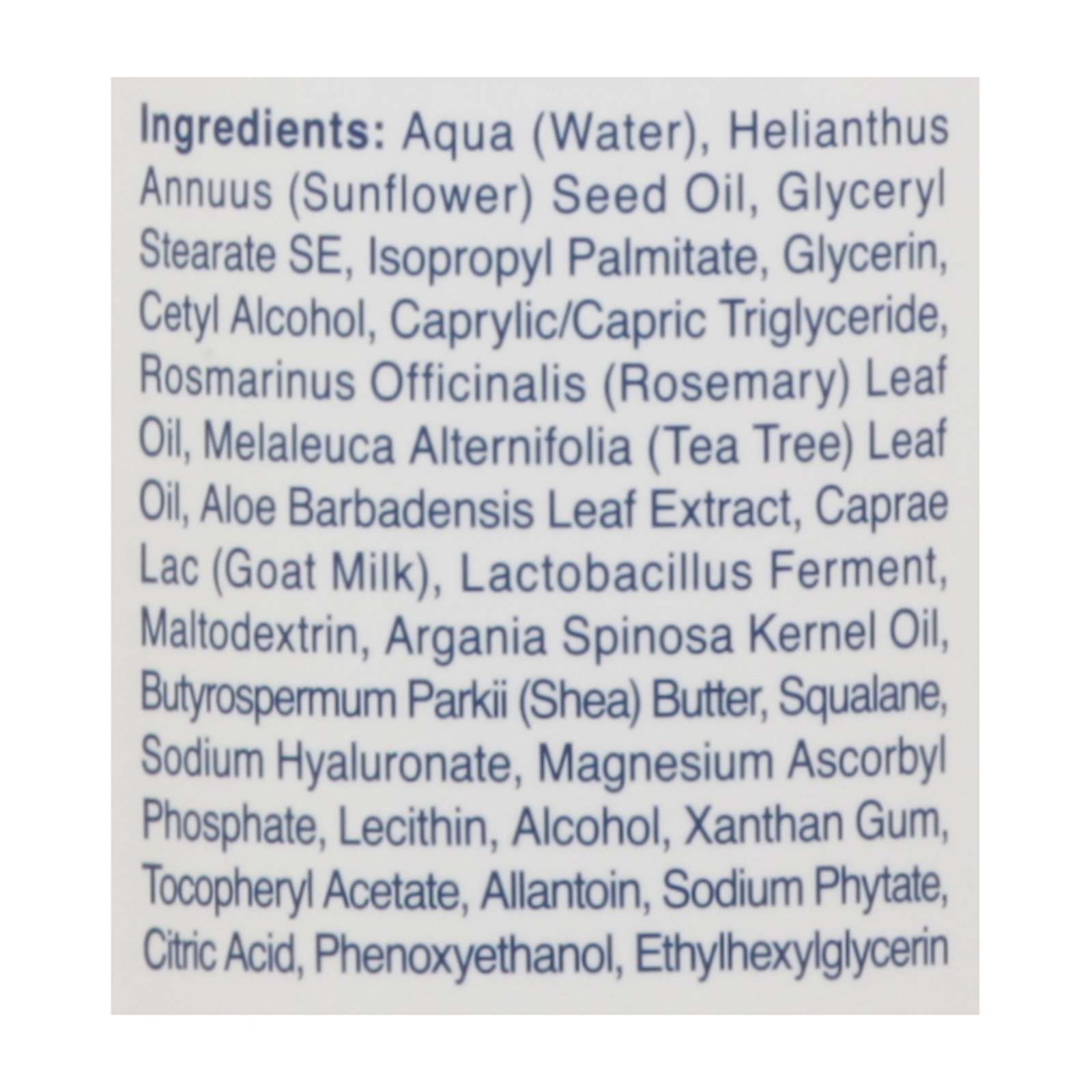 ingredients : aqua (water);helianthus annuus (sunflower) seed oil;glyceryl stearate se;isopropyl palmitate;glycerin;cetyl alcohol;caprylic/capric triglyceride;rosmarinus officinalis (rosemary) leaf oil;melaleuca alternifolia (tea tree) leaf oil;aloe barbadensis leaf extract;caprae lac (goat milk);lactobacillus ferment;maltodextrin;argania spinosa kernel oil;butyrospermum parkii (shea) butter;squalane;sodium hyaluronate;magnesium ascorbyl phosphate;lecithin;alcohol;xanthan gum;tocopheryl acetate;allantoin;sodi