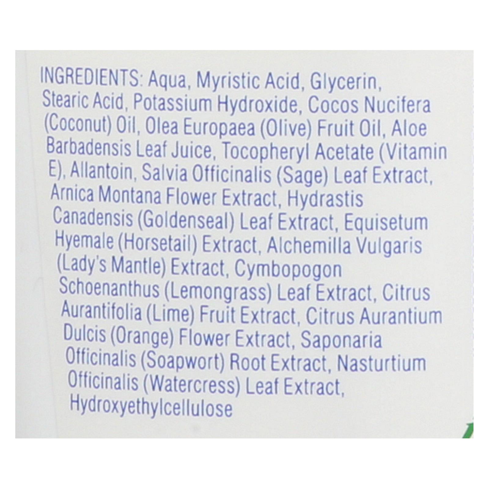 ingredients : aqua;myristic acid;glycerin;stearic acid;potassium hydroxide;cocos nucifera;coconut;oil;olea europaea;olive;fruit oil;aloe barbadensis leaf juice;tocopheryl acetate;vitamin e;allantoin;salvia officinalis;sage;leaf extract;arnica montana flower extract;hydrastis canadensis;goldenseal;equisetum hyemale;horsetail;extract;alchemilla vulgaris;lady’s mantle;cymbopogon schoenanthus;lemongrass;citrus aurantifolia;lime;fruit extract;citrus aurantium dulcis;orange;flower extract;saponaria officinalis;soap