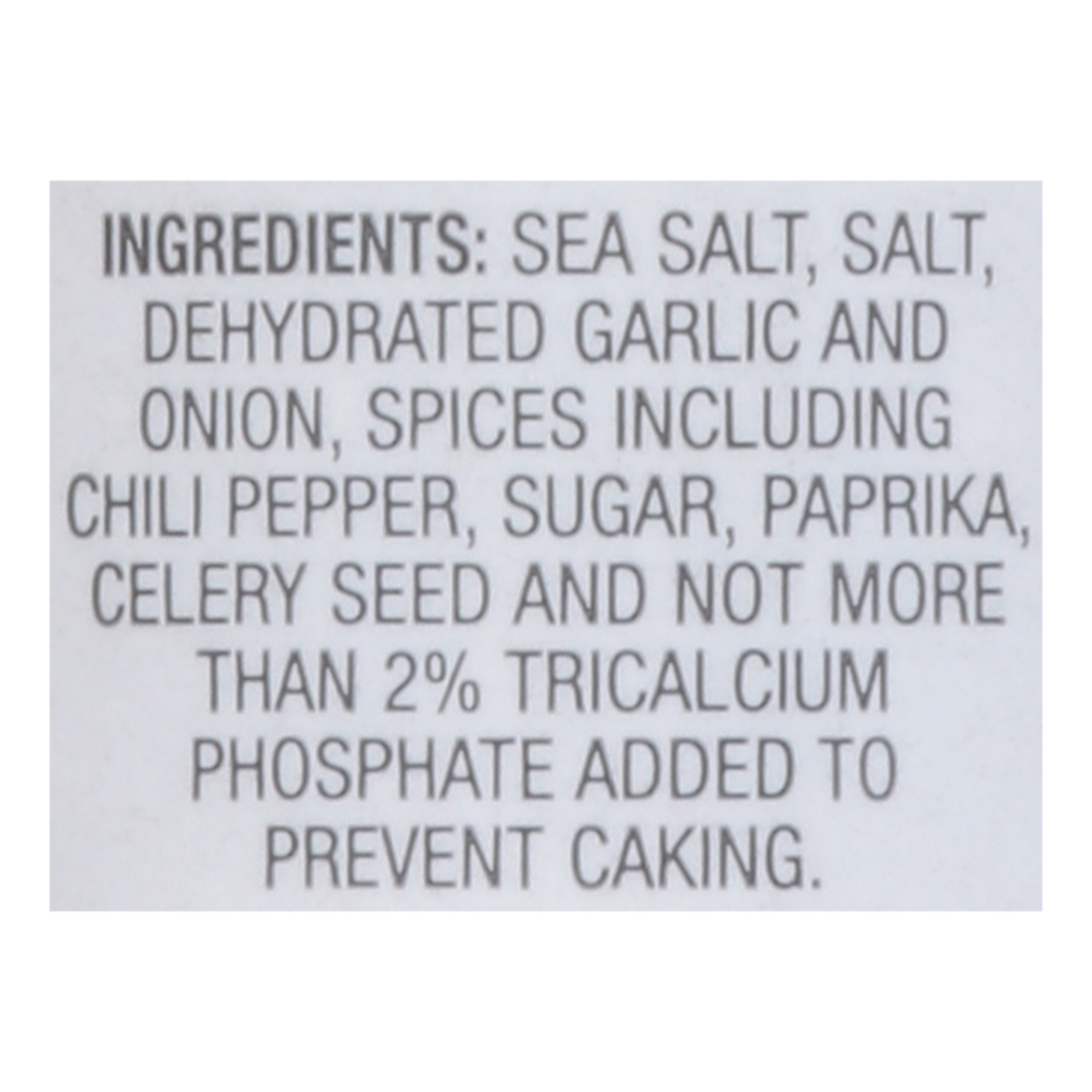 ingredients : sea salt;salt;dehydrated garlic and onion;spices including chili pepper;sugar;paprika;celery seed and not more than 2% tricalcium phosphate added to prevent caking