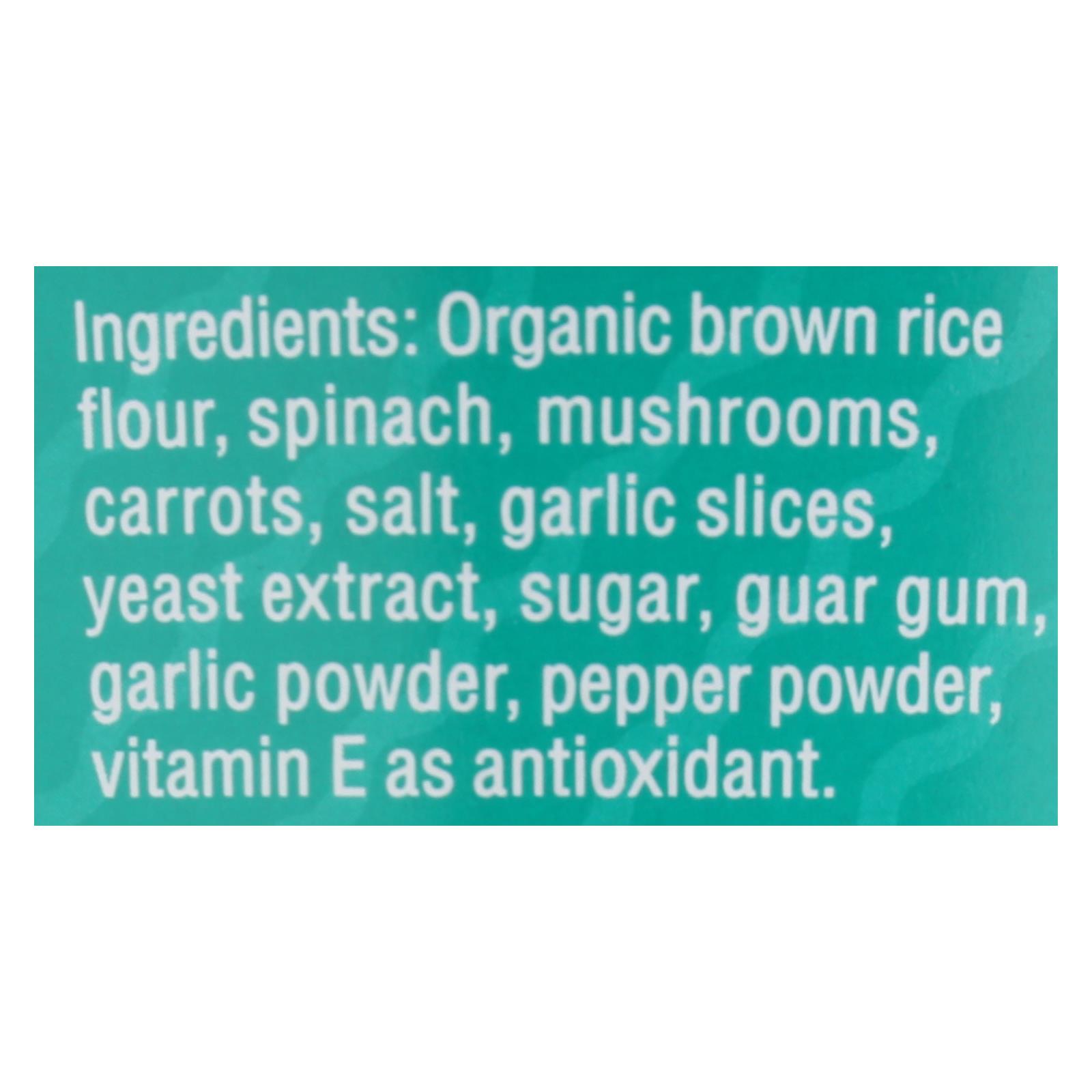 ingredients : organic brown rice flour;spinach;mushrooms;carrots;salt;garlic slices;yeast extract;sugar;guar gum;garlic powder;pepper powder;vitamin e as antioxidant