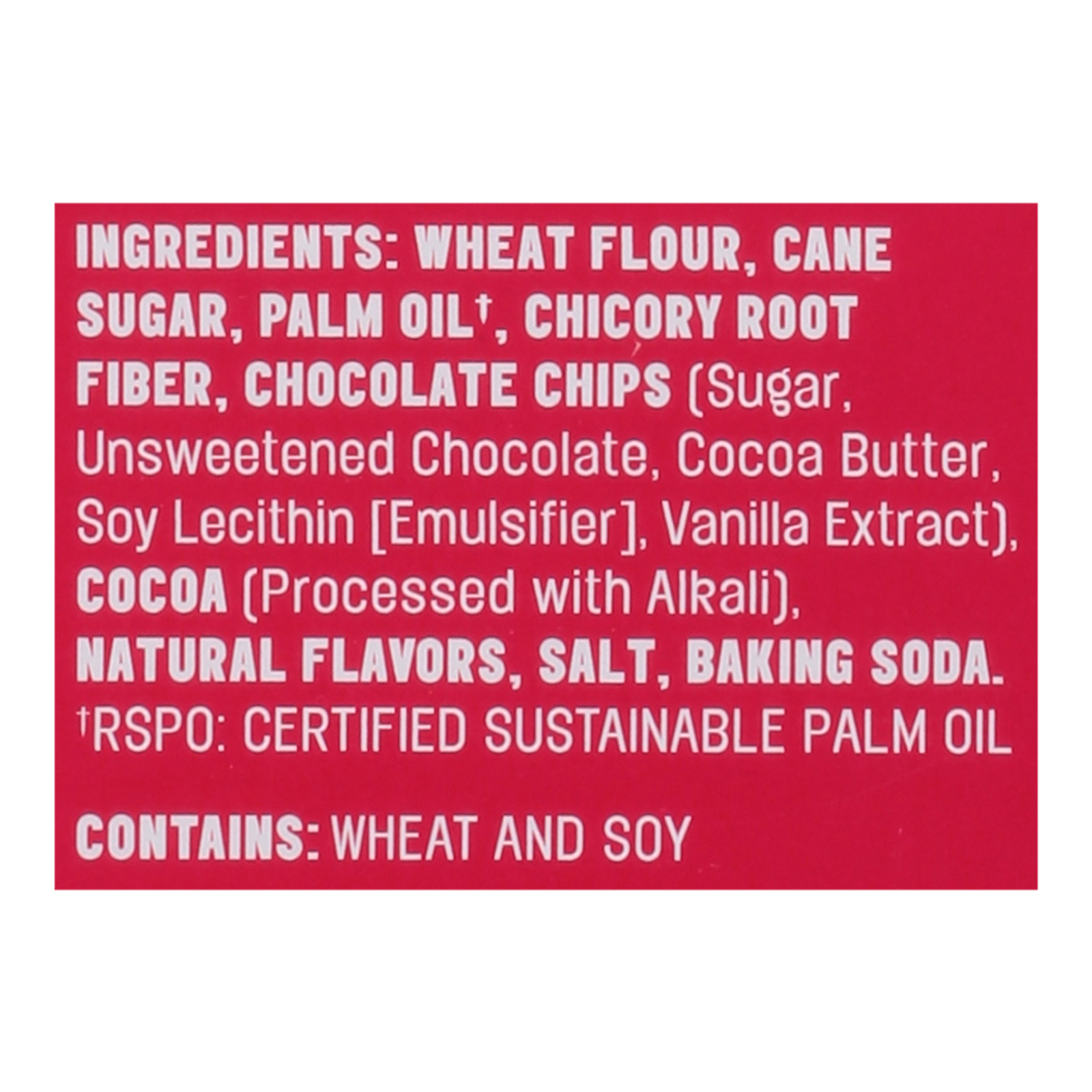 ingredients : wheat flour;cane sugar;palm oil;chicory root fiber;chocolate chips (sugar, unsweetened chocolate, cocoa butter, soy lecithin [emulsifier], vanilla extract);cocoa (processed with alkali);natural flavors;salt;baking soda