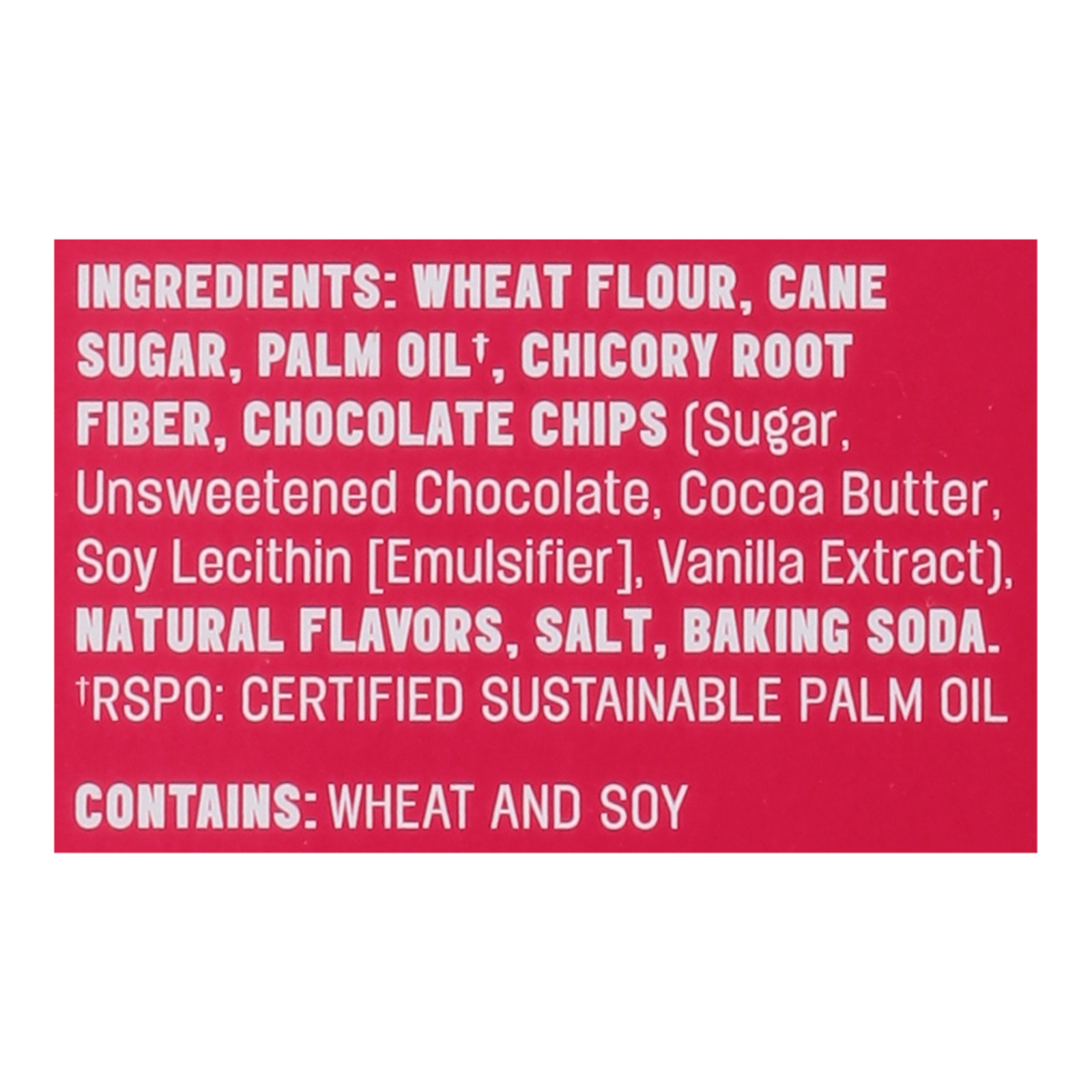 ingredients : wheat flour;cane sugar;palm oil†;chicory root fiber;chocolate chips (sugar, unsweetened chocolate, cocoa butter, soy lecithin [emulsifier], vanilla extract);natural flavors;salt;baking soda