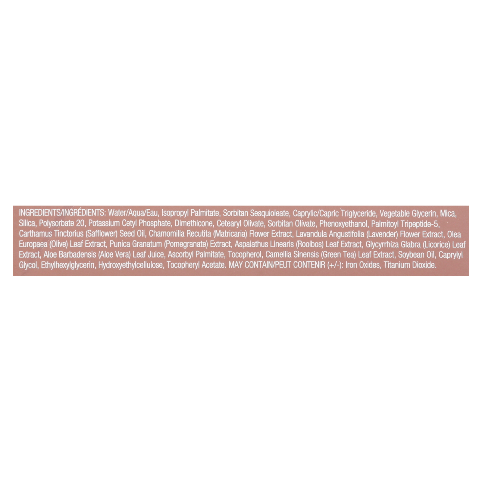 ingredients : water/aqua;isopropyl palmitate;sorbitan sesquioleate;caprylic/capric triglyceride;vegetable glycerin;mica;silica;polysorbate 20;potassium cetyl phosphate;dimethicone;cetearyl olivate;sorbitan olivate;phenoxyethanol;palmitoyl tripeptide-5;carthamus tinctorius (safflower) seed oil;chamomilla recutita (matricaria) flower extract;lavandula angustifolia (lavender) flower extract;olea europaea (olive) leaf extract;punica granatum (pomegranate) extract;aspalathus linearis (rooibos) leaf extract;glycyrr