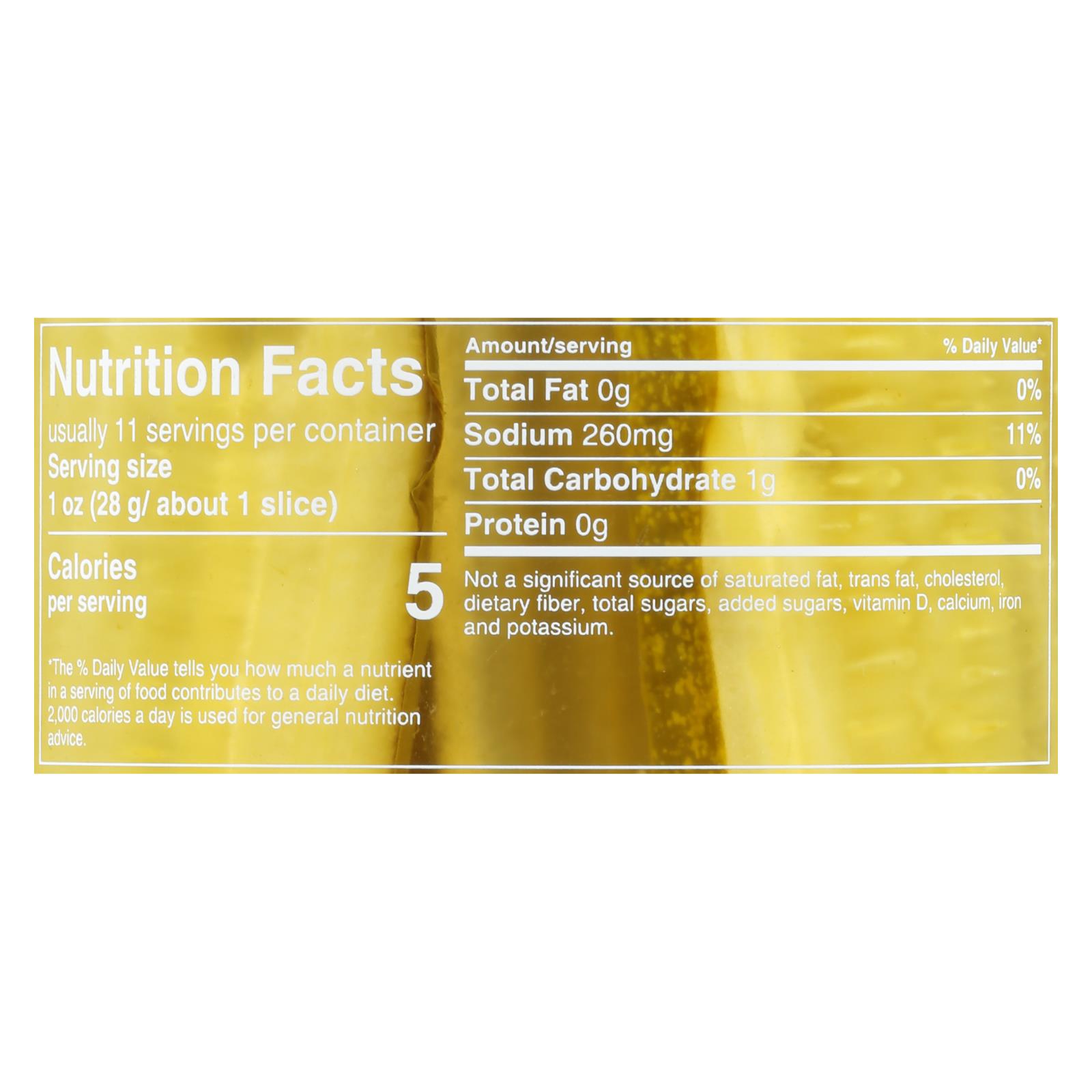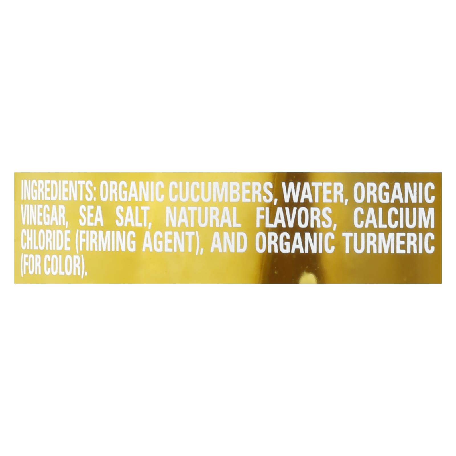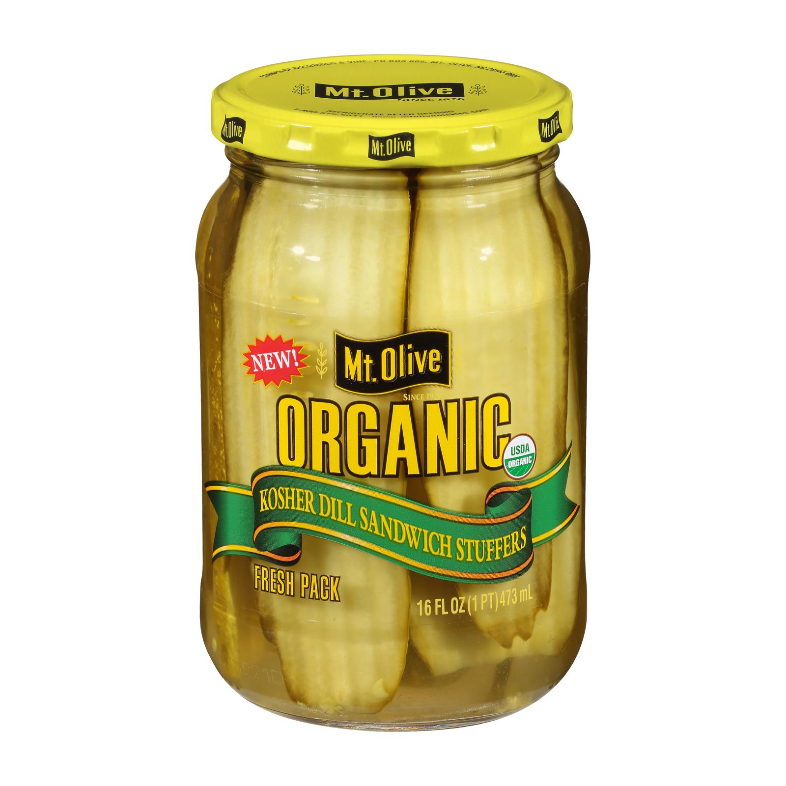 Usda organic. Certified organic by baystate organic certifiers. Gluten free. Vegan. No saturated fat. Low calorie. Cholesterol free. No gmo. New! since 1926. Fresh pack. No: high fructose corn syrup; yellow no. 5. Www.mtolivepickles.com. Visit mtolivepickles.com. Please recycle.