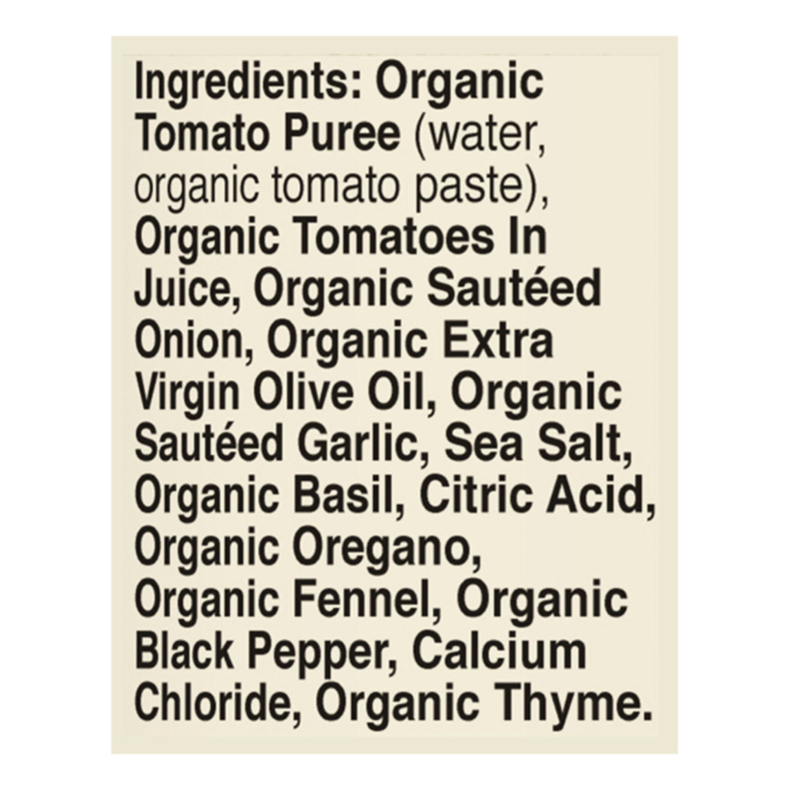 ingredients : organic tomato puree (water, organic tomato paste);organic tomatoes in juice;organic saut ed onion;organic extra virgin olive oil;organic saut ed garlic;sea salt;organic basil;citric acid;organic oregano;organic fennel;organic black pepper;calcium chloride;organic thyme