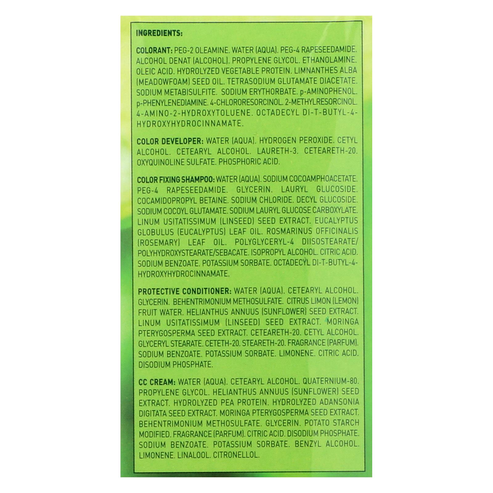 ingredients : cc cream: water;aqua;cetearyl alcohol;quaternium-80;propylene glycol. Helianthus annuus;sunflower;seed extract. Hydrolyzed pea protein. Hydrolyzed adansonia digitata seed extract. Moringa pterygosperma seed extract. Behentrimonium methosulfate. Glycerin. Potato starch modified. Fragrance;parfum;citric acid. Disodium phosphate. Sodium benzoate. Potassium sorbate. Benzyl alcohol. Limonene. Linalool. Citronellol;color developer: water;hydrogen peroxide. Cetyl alcohol. Cetearyl alcohol. Laureth-3. C
