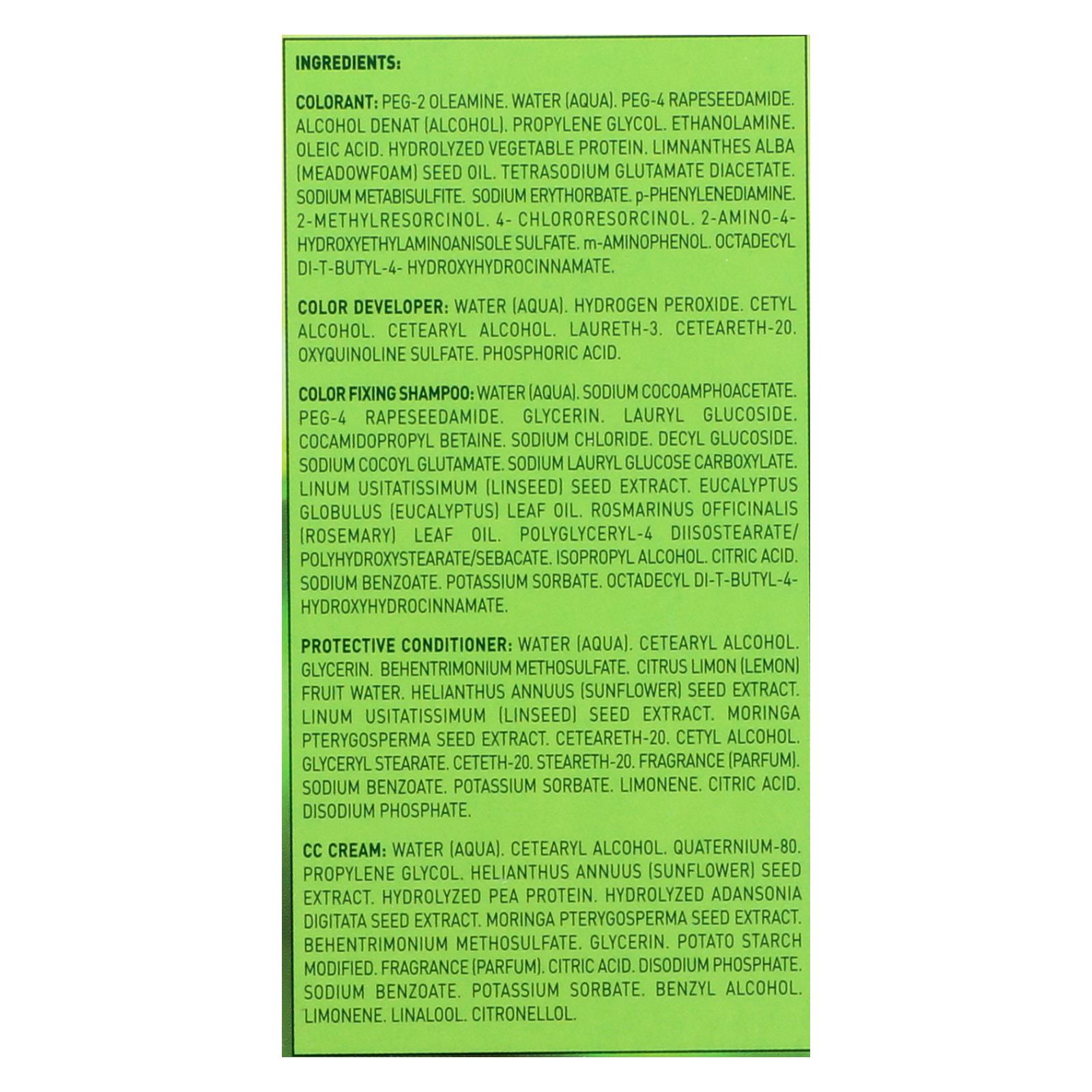 ingredients : cc cream: water;aqua;cetearyl alcohol;quaternium-80;propylene glycol. Helianthus annuus;sunflower;seed extract. Hydrolyzed pea protein. Hydrolyzed adansonia digitata seed extract. Moringa pterygosperma seed extract. Behentrimonium methosulfate. Glycerin. Potato starch modified. Fragrance;parfum;citric acid. Disodium phosphate. Sodium benzoate. Potassium sorbate. Benzyl alcohol. Limonene. Linalool. Citronellol;color developer: water;hydrogen peroxide. Cetyl alcohol. Cetearyl alcohol. Laureth-3. C