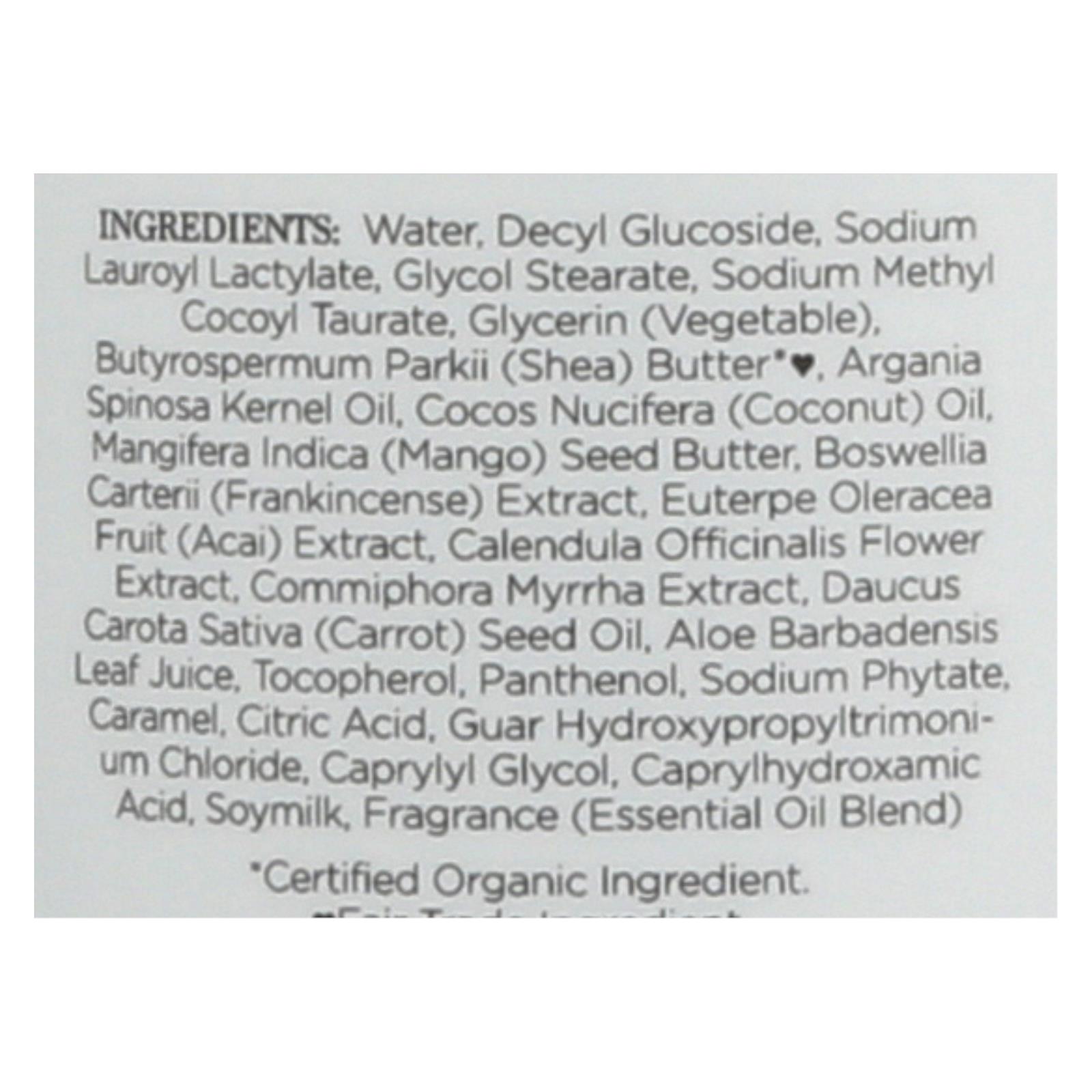 ingredients : water;decyl glucoside;sodium lauroyl lactylate;glycol stearate;sodium methyl cocoyl taurate;glycerin;vegetable;butyrospermum parkii;shea;butter*♥;argania spinosa kernal oil;cocos nucifera;coconut;oil;mangifera indica;mango;seed butter;boswellia carterii;frankincense;extract;euterpe oleracea fruit;acai;calendula officinalis flower extract;commiphora myrrha extract;daucus carota sativa;carrot;seed oil;aloe barbadensis leaf juice;tocopherol;panthenol;sodium phytate;caramel;citric acid;guar hydroxyp