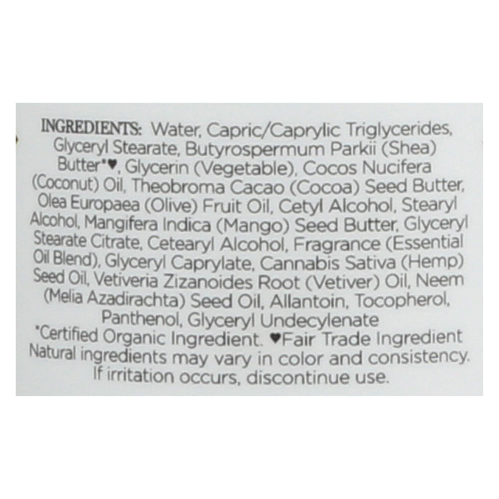 ingredients : water;capric/caprylic triglycerides;glyceryl stearate;butyrospermum parkii;shea;butter*♥;glycerin;vegetable;cocos nucifera;coconut;oil;theobroma cacao;cocoa;seed butter olea europaea;olive;fruit oil;cetyl alcohol;stearyl alcohol;mangifera indica;mango;seed butter;glyceryl stearate citrate;cetearyl alcohol;fragrance;essential oil blend;glyceryl caprylate;cannabis sativa;hemp;seed oik;vetiveria zizanoides root;vetiver;neem;melia azadirachta;seed oil;allantoin;tocopherol;panthenol;glyceryl undecyle