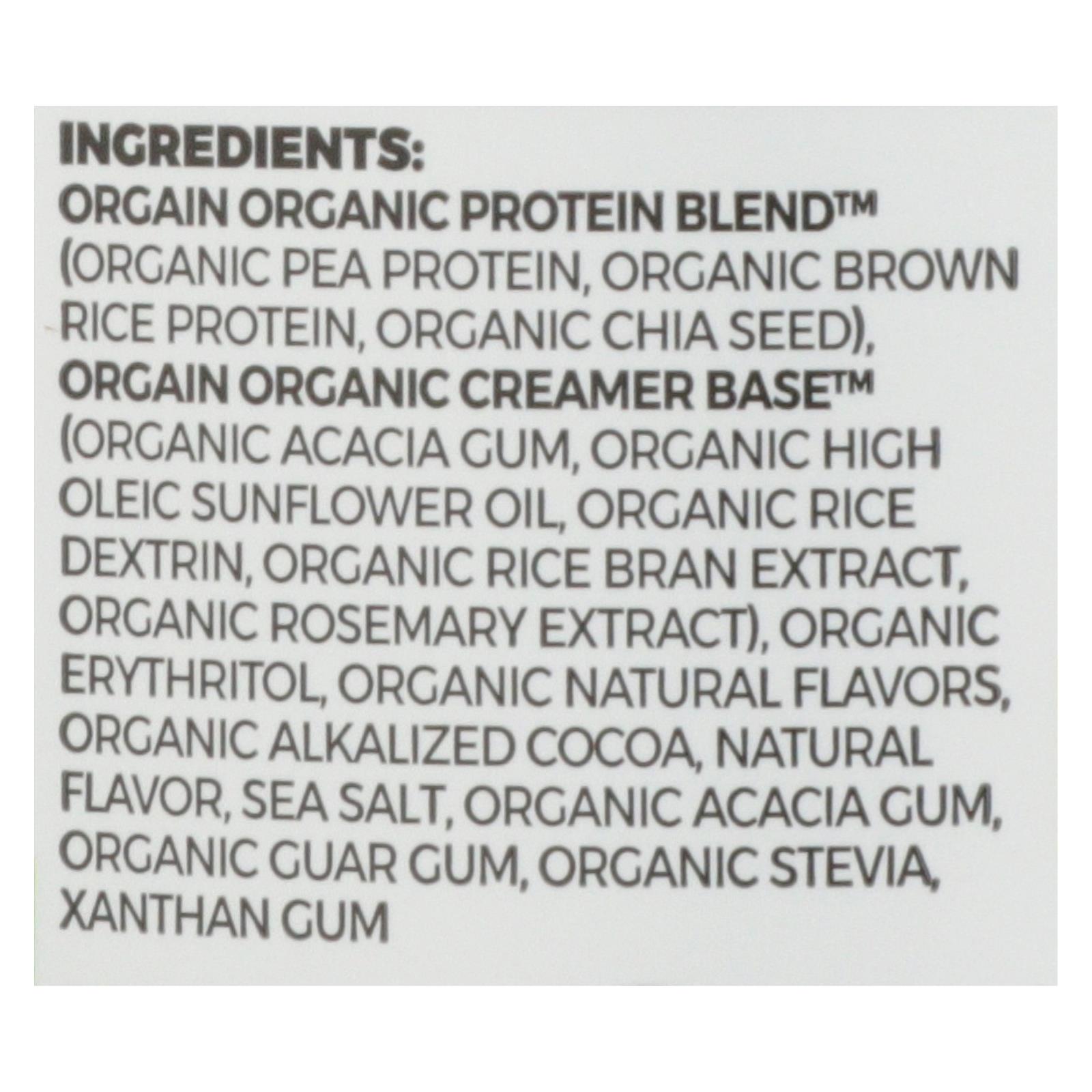 ingredients : orgain organic protein blendâ„¢;organic pea protein;organic brown rice protein;organic chia seed;orgain organic creamer baseâ„¢;organic acacia;organic high oleic sunflower oil organic rice dextrin;organic rice bran extract;organic rosemary extract;organic erythritol;organic alkalized cocoa;organic natural flavors;sea salt;organic stevia organic guar gum;natural flavor;xanthan gum