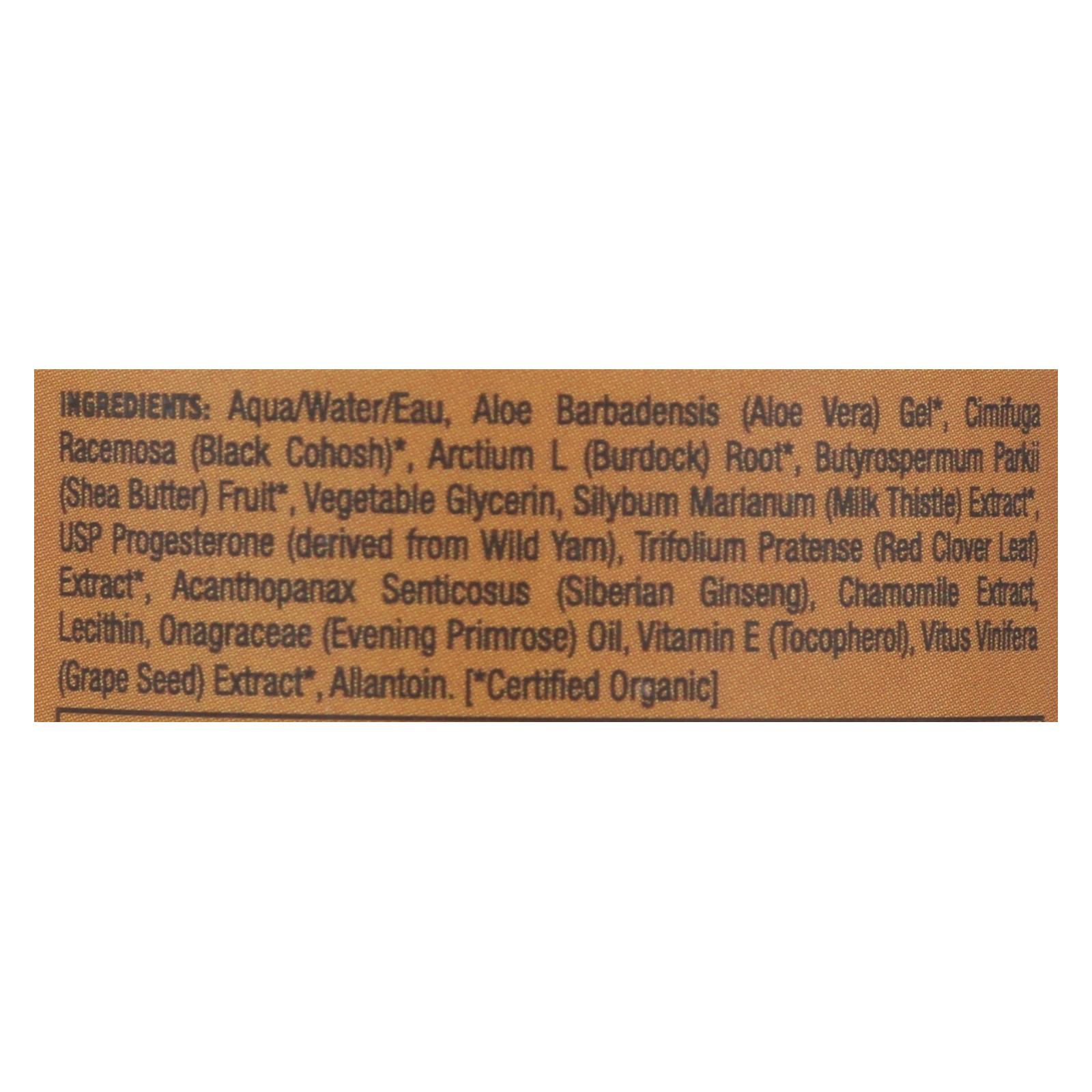 ingredients : aqua/water/eau;aloe barbadensis;aloe vera;gel;cimifuga racemosa;black cohosh;arctium l;burdock;root;butyrospermum parkii;shea butter;fruit;vegetable glycerin;silybum marianum;milk thistle;extract;usp progesterone;derived from wild yam;trifolium pratense;red clover leaf;acanthopanax senticosus;siberian ginseng;chamomile extract;lecithin;onagraceae;evening primrose;oil;vitamin e;tocopherol;vitus vinifera;grape seed;allantoin