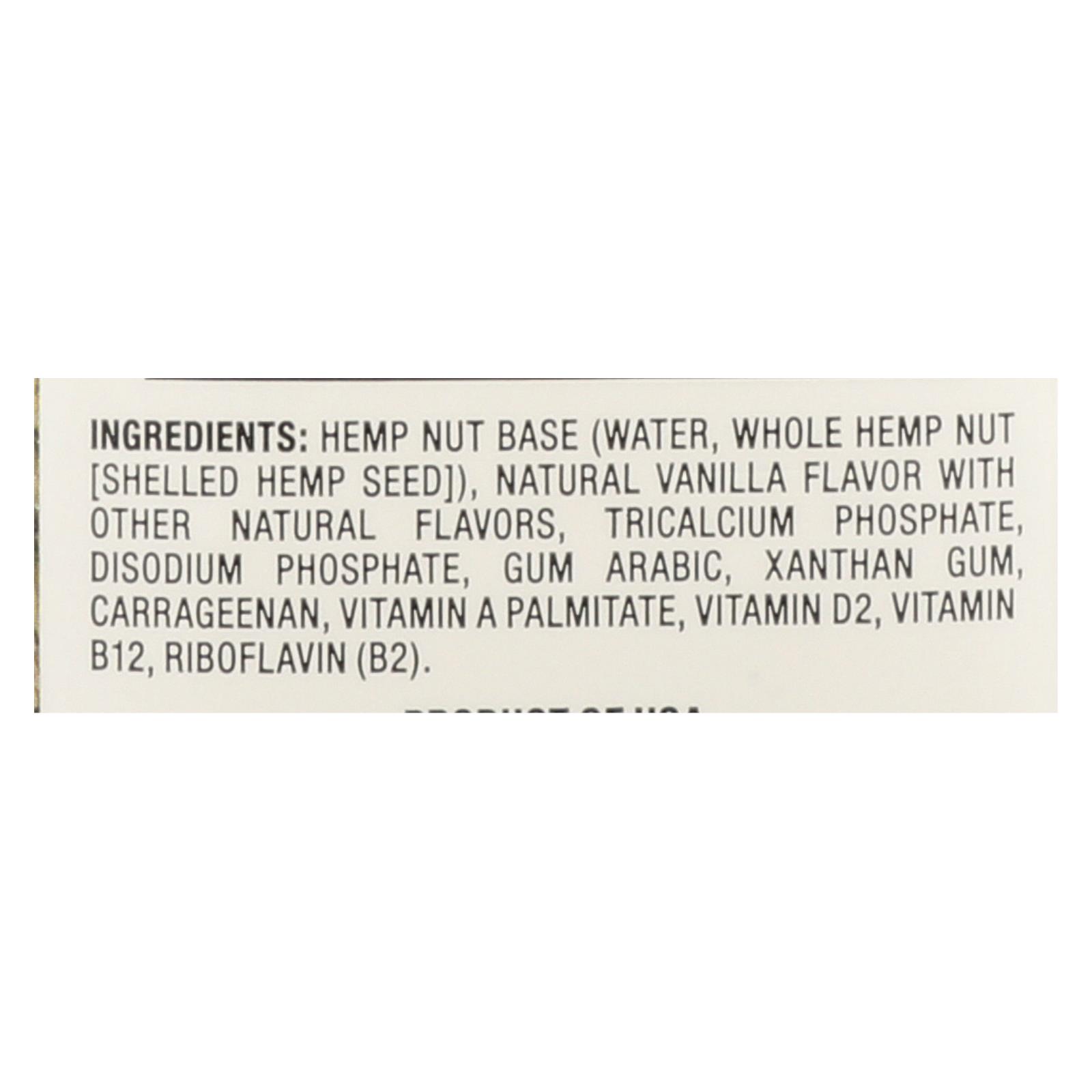 ingredients : hemp nut base;water;whole hemp nut [shelled hemp seed];natural vanilla flavor with other natural flavors;tricalcium phosphate;disodium phosphate;gum arabic;xanthan gum;carrageenan;vitamin a palmitate;vitamin d2;vitamin b12;riboflavin;b2