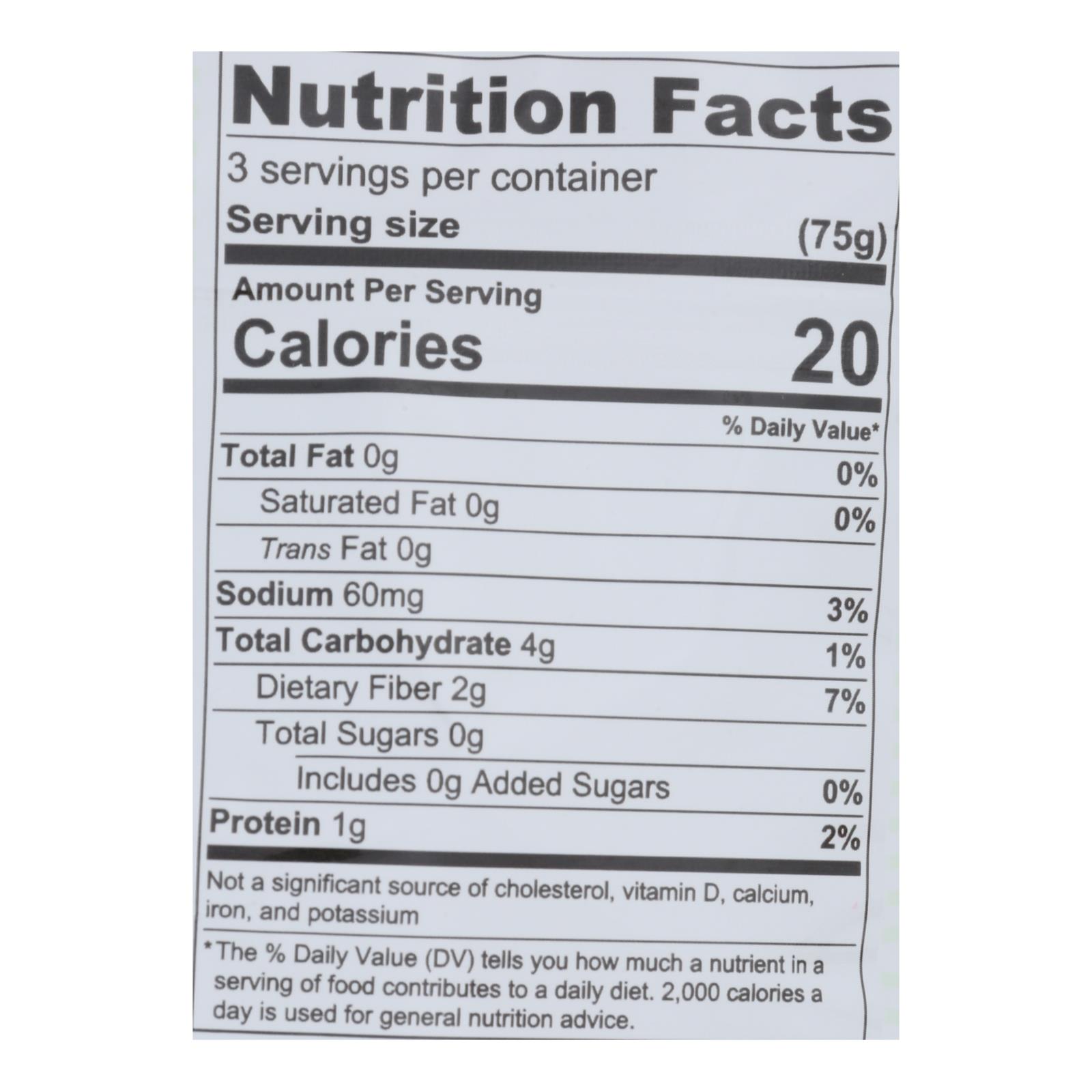 Dr wt. 220 g (7.8 oz). 4 g of carbs. 20 calories per serving. Per serving: 20 calories (per serving); 4 g carbs (per serving). Vegan. Gluten free. Sugar free. Non gmo project verified. Nongmoproject.org. Palmini is a pasta substitute made out of a natural plant known as hearts of palm. When this plant is cut and cooked in the proper way, its resemblance to regular pasta is remarkable. Palmini is made from cultivated hearts of palm and harvested in an environmentally sustainable way. A healthier tomorrow. Www.eatpalmini.com. Instagram: palmini_pasta. Facebook: palmini.pasta. For recipes and more information visit us at: www.eatpalmini.com. Instagram: palmini(underscore)pasta. Facebook: palmini.pasta. Made in ecuador.