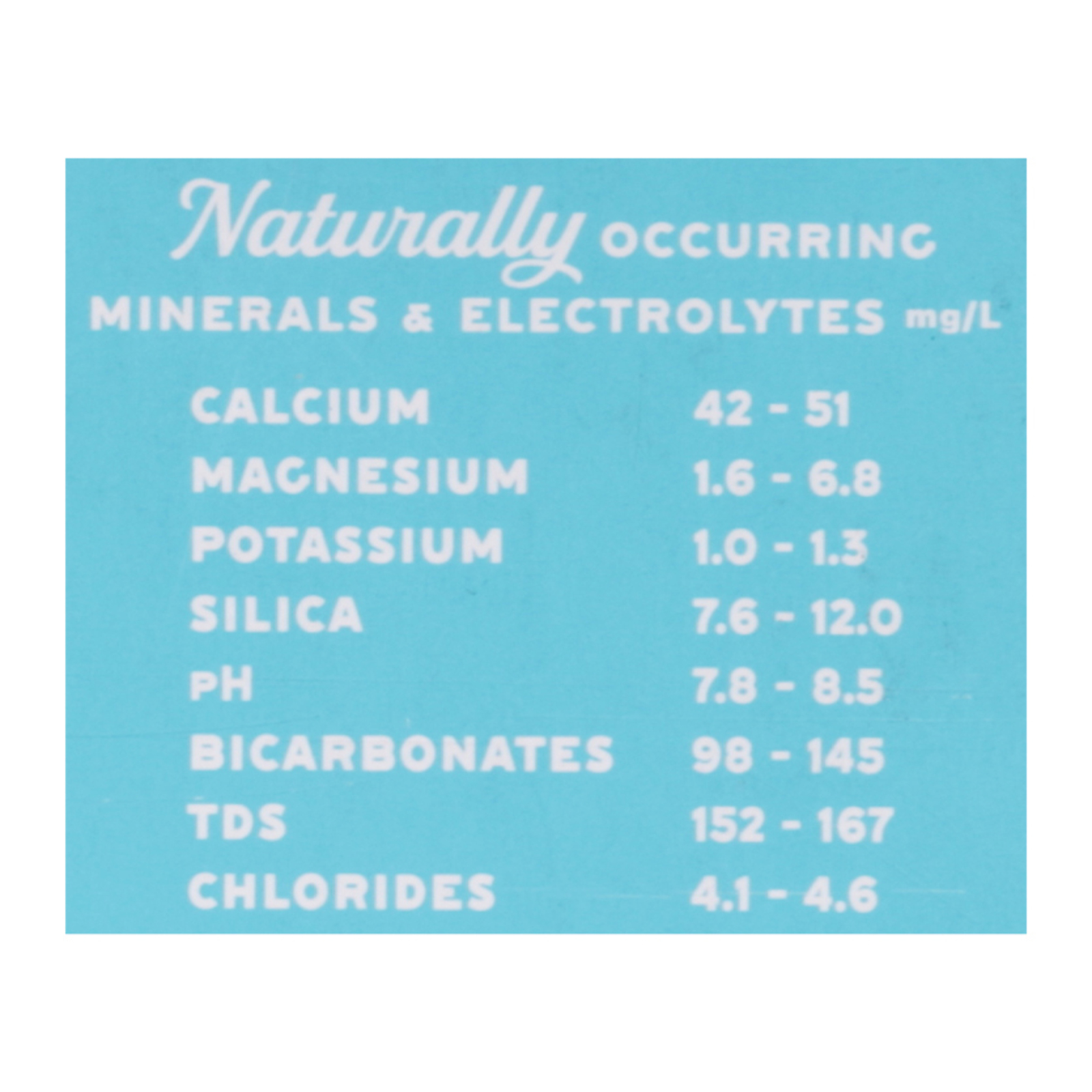 Alkaline 8.1 +/- ph. Naturally occurring minerals & electrolytes. Natural alkaline spring water.